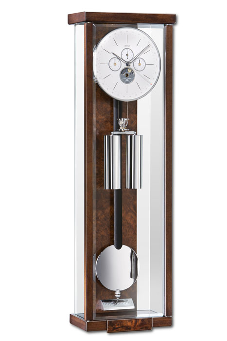 Die Wanduhr 2852-22-03 von Kieninger ist ein extrem flacher, moderner Miniatur-Monatsläufer-Seilzugregulator mit Gehäuse in dunklem Nußbaum/Nußbaumwurzel und UV-verklebten Glasseiten. Das Modell verfügt zudem über ein Schlüsselschubfach, ein Kalendariumszifferblatt mit diamantgedrehten Zierringen sowie über eine Anzeige für Mondphasen, Sekunden, Datum, Wochentag und Monat. Alle sichtbaren Garniturteile sind verchromt.