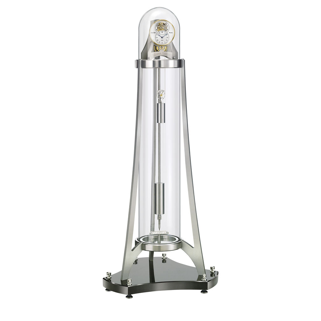 Das auffälligste Merkmal der Standuhr Columna Temporis von Erwin Sattler ist ihre völlige Transparenz, die sie mit ihrem gläsernen Körper erreicht. Die Frontansicht fasziniert durch das versilberte Zifferblatt mit den gebläuten Stahlzeigern, durch dessen Öffnung der Blick direkt auf die wunderschön gestaltete Hemmung gelenkt wird.