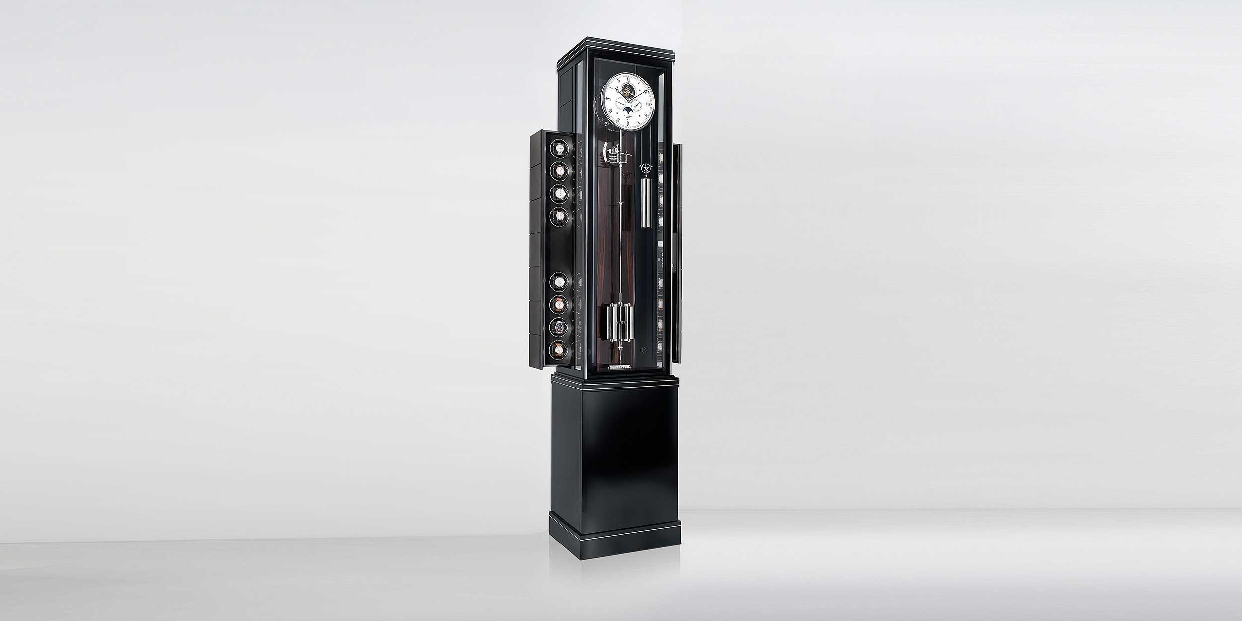 Im Gehäusesockel ist ein Tresor untergebracht, der für verschiedene Schätze Raum bietet. Um die gewonnene Tiefe zu nutzen, sind zudem 16 ferngesteuert ausfahrbare Uhrenbeweger im hinteren Teil des Gehäuses untergebracht. Zusammen mit dem Technologie-Partner Beluwo® entwickelte die Manufaktur neue, große Armbanduhraufnahmen, die ausreichend Platz bieten für größere Zeitmesser. Jede Einheit ist mit einem eigenen Präzisionsmotor ausgestattet und kann mithilfe eines Smartinterface über jedes Smartphone bzw. Tablet einzeln programmiert werden. Die Standuhr Troja Lunaris M (Schwarz/Makassar) ist ausgestattet mit dem außergewöhnlichen Uhrwerk der Secunda Lunaris, deren versilbertes Zifferblatt die Wertigkeit der in liebevoller Handarbeit gefertigten, bombierten Zeiger unterstreicht. Das Pendel bewirkt mit seiner stattlichen Länge von ca. einem Meter ein elegantes und zugleich beruhigendes Schwingen im Sekundentakt.