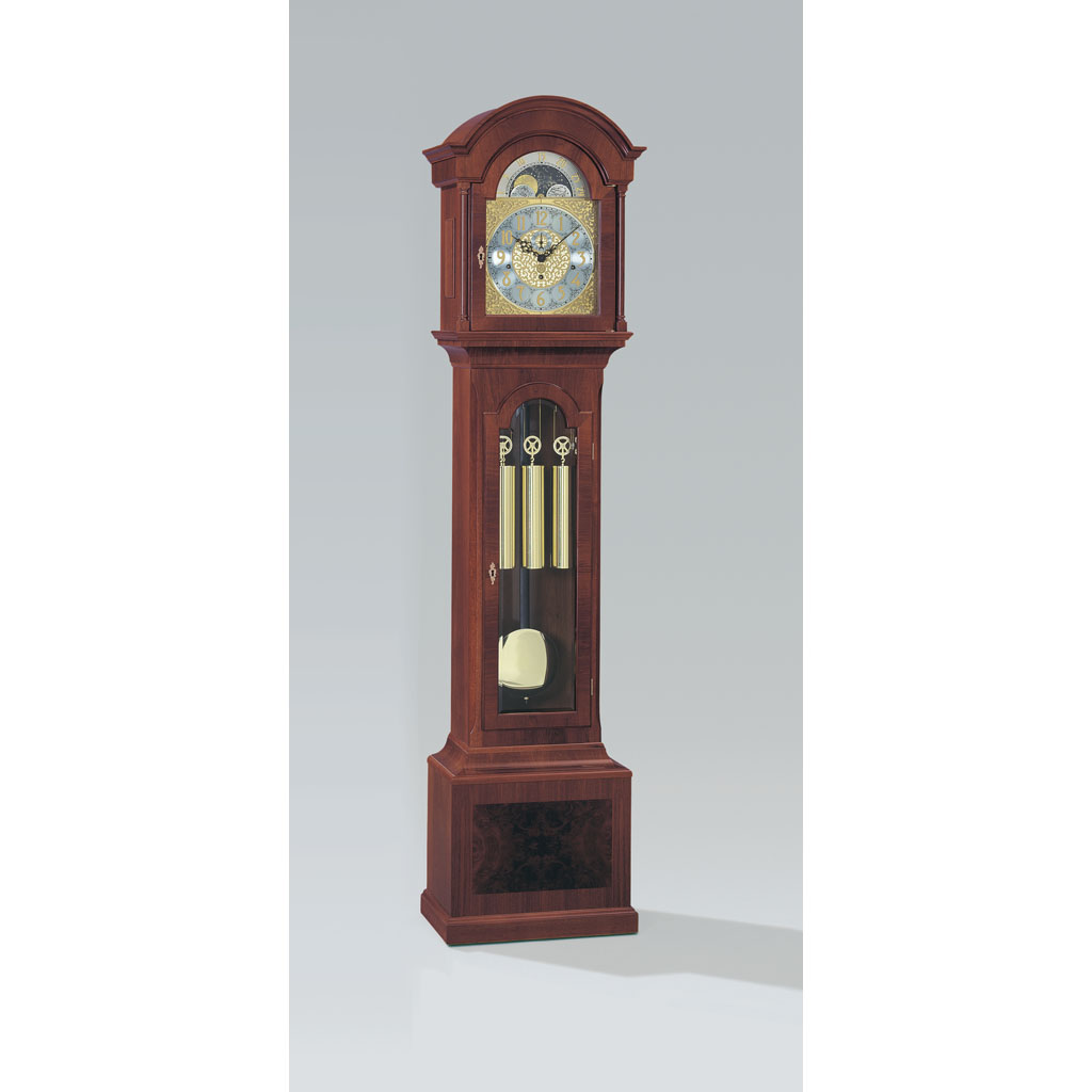 Hiermit präsentieren wir Ihnen eine aufwendig gearbeitete klassische Standuhr 0105-31-01 von Kieninger im englischen Stil. Das Gehäuse ist aus Mahagoni gefertigt. Die Uhr verfügt über zwei Türen mit facettierten Kristallgläsern sowie ein hochwertiges Messingzifferblatt mit Mondphase, Sekundenanzeige, aufgelegten vergoldeten Zierteilen und arabischen Ziffern. Das 16,5 cm Sekundenpendel ist poliert.