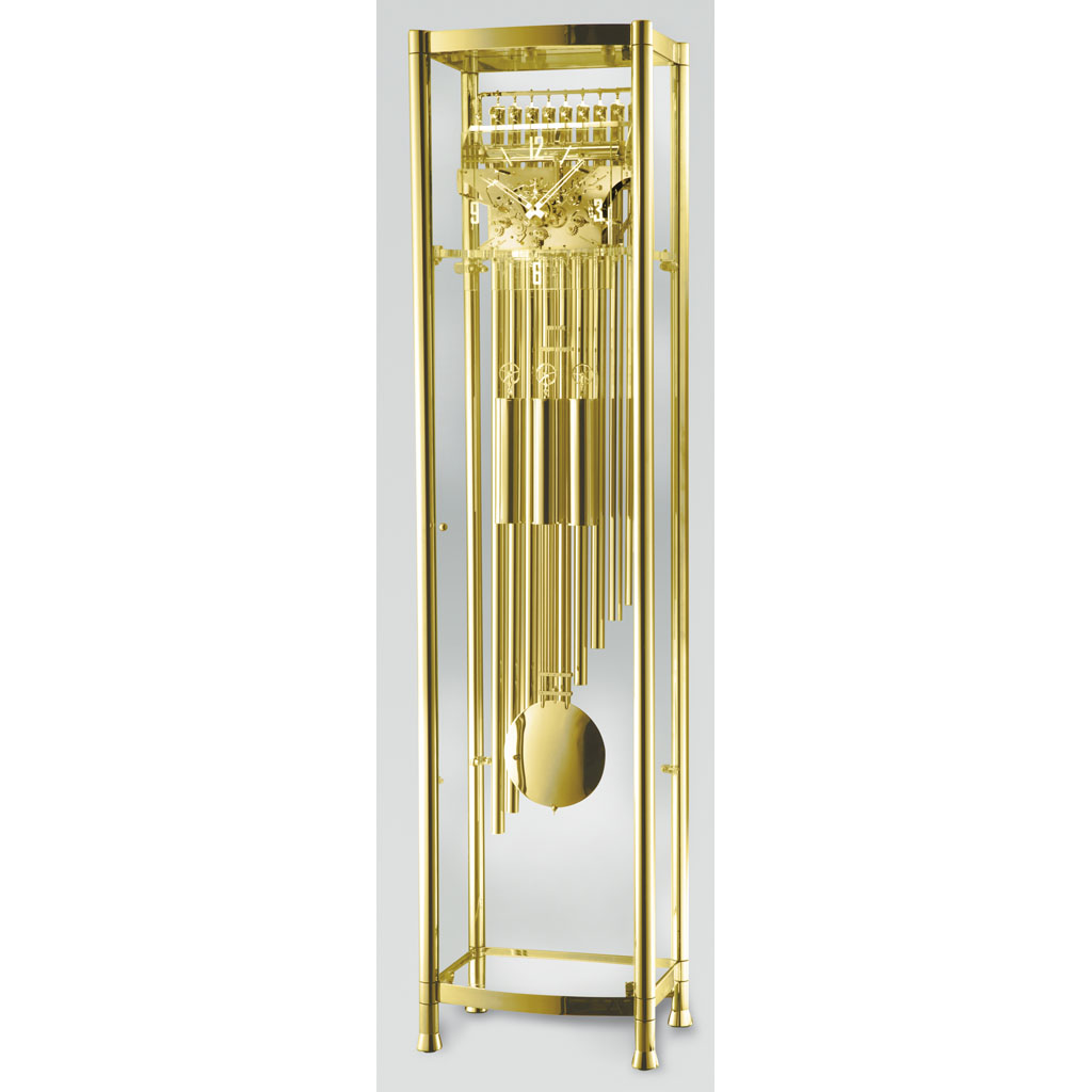 Das edle Designer-Vitrinengehäuse der Standuhr 0126-06-01 von Kieninger mit vergoldeten Rahmenteilen, drei LED-Spots und leicht gebogenem Türglas erfüllt höchste Ansprüche. Das Zifferblatt besteht aus Floatglas und verfügt über eine Sekundenanzeige sowie einen Leuchteffekt. Das hochwertige Sekunden-Kompensationspendel verfügt über eine Feinregulierung. Alle sichtbaren Garniturteile sind verchromt. Es handelt sich um eine nummerierte Edition.