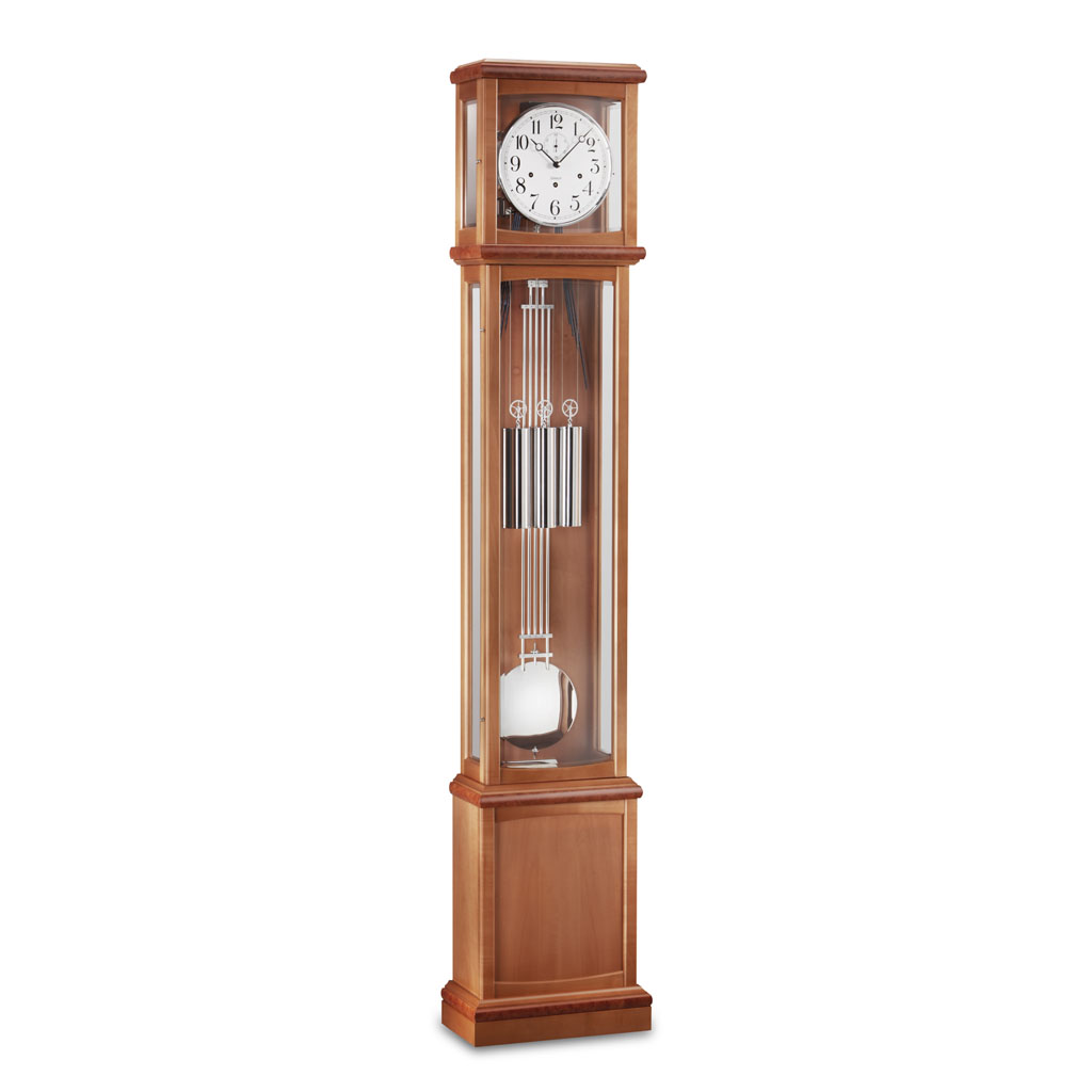 Die elegante, feine Standuhr 0134-37-01 von Kieninger in Birnbaum besticht durch handpolierte Wurzelfurnierteile. Die Türen, das Dach und die Seiten sind mit facettierten Gläsern ausgestattet. Das arabische Zifferblatt hat einen Durchmesser von 24 cm und verfügt über eine Sekundenanzeige sowie handgefräste Breguet-Zeiger. Das hochwertige Gitter-Kompensationspendel ist mit einer Feinregulierung versehen. Alle sichtbaren Garniturteile sind verchromt.
