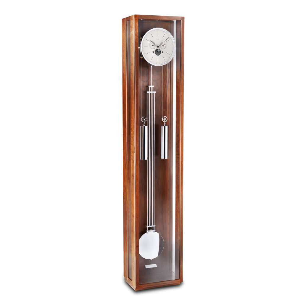 Moderne, in der Formensprache reduzierte Standuhr 0139-26-01 von Kieninger in dunklem Nußbaum mit LED-Beleuchtung und einem in Handarbeit verfeinertem GSE-Seilzugwerk (3 mm-Platinen, 12 Rubin- und 8 Kugellager, spezielle Pendel- und Gewichtsaufhängung). Imposanter BimBam Halbstundenschlag auf verdeckt montiertem 8-Stabgong. Kalendariumszifferblatt mit Datums-, Wochentags-, Monats- und Mondphasenanzeige. Überlanger Kompensationspendel und Pendelskala. Alle sichtbaren Garniturteile in Chromfinish.