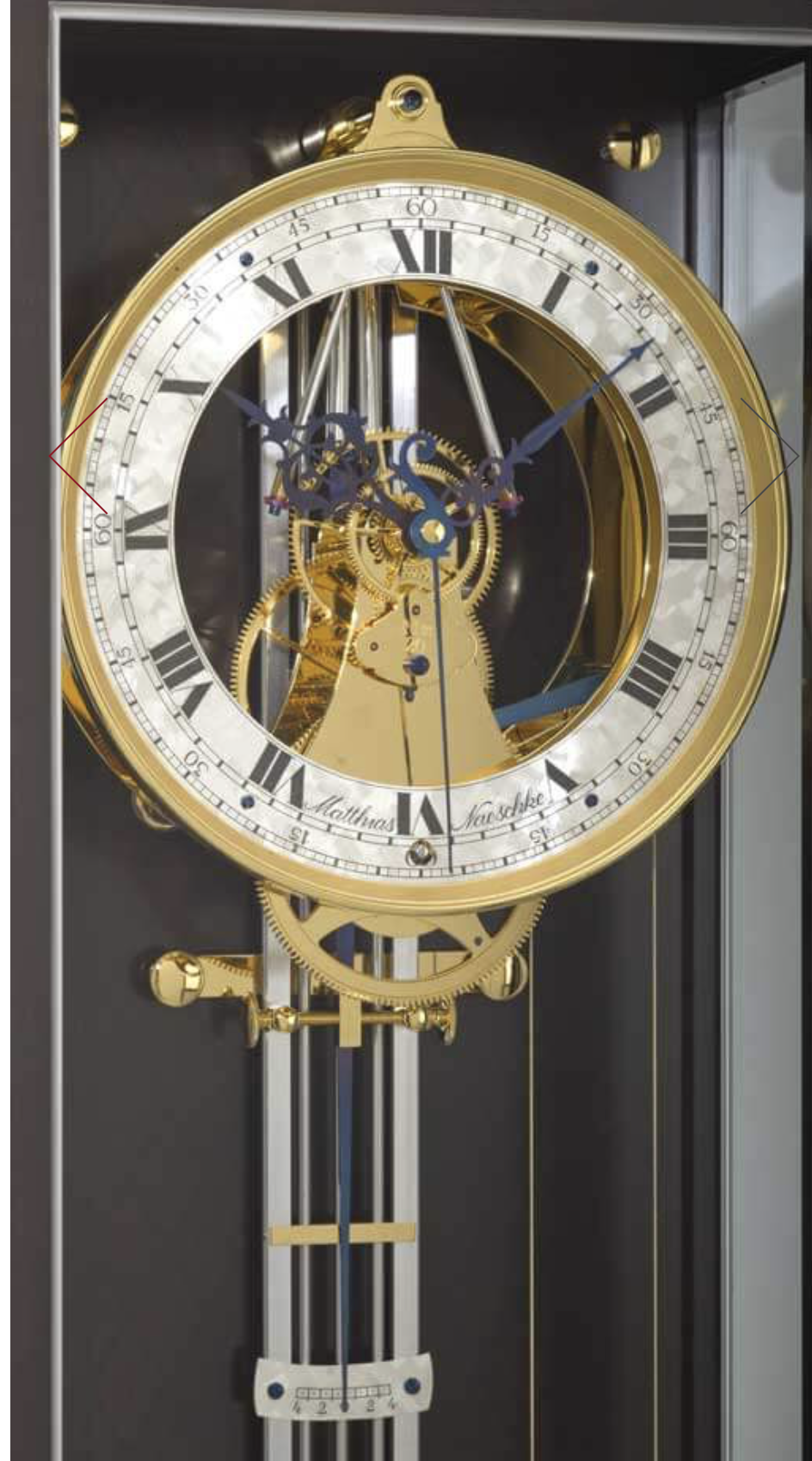 Das hochglanzpolierte Uhrwerk bildet zusammen mit dem massiven Sterlingsilber-Ziffernring, den gebläuten Prachtzeigern und einem edel abgedunkelten Kirschholzgehäuse mit feinen Einlegearbeiten und Silberstreifen eine stilistische Einheit.
