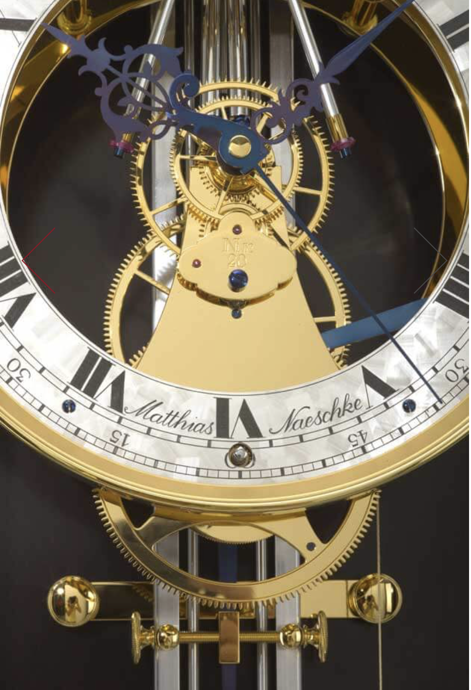 Die 21 Tage laufende 1 ¼ Sekunden-Präzisionspendeluhr NL 125 GG von Matthias Naeschke mit freier Schwerkrafthemmung und Zentralsekunde ist eine Uhr, die es in dieser Konstruktion, Bauform und Qualität noch nie gab. Die authentische Konzeption beweist, dass die Entwicklungsmöglichkeiten mechanischer Präzisionsuhren noch längst nicht ausgeschöpft sind.