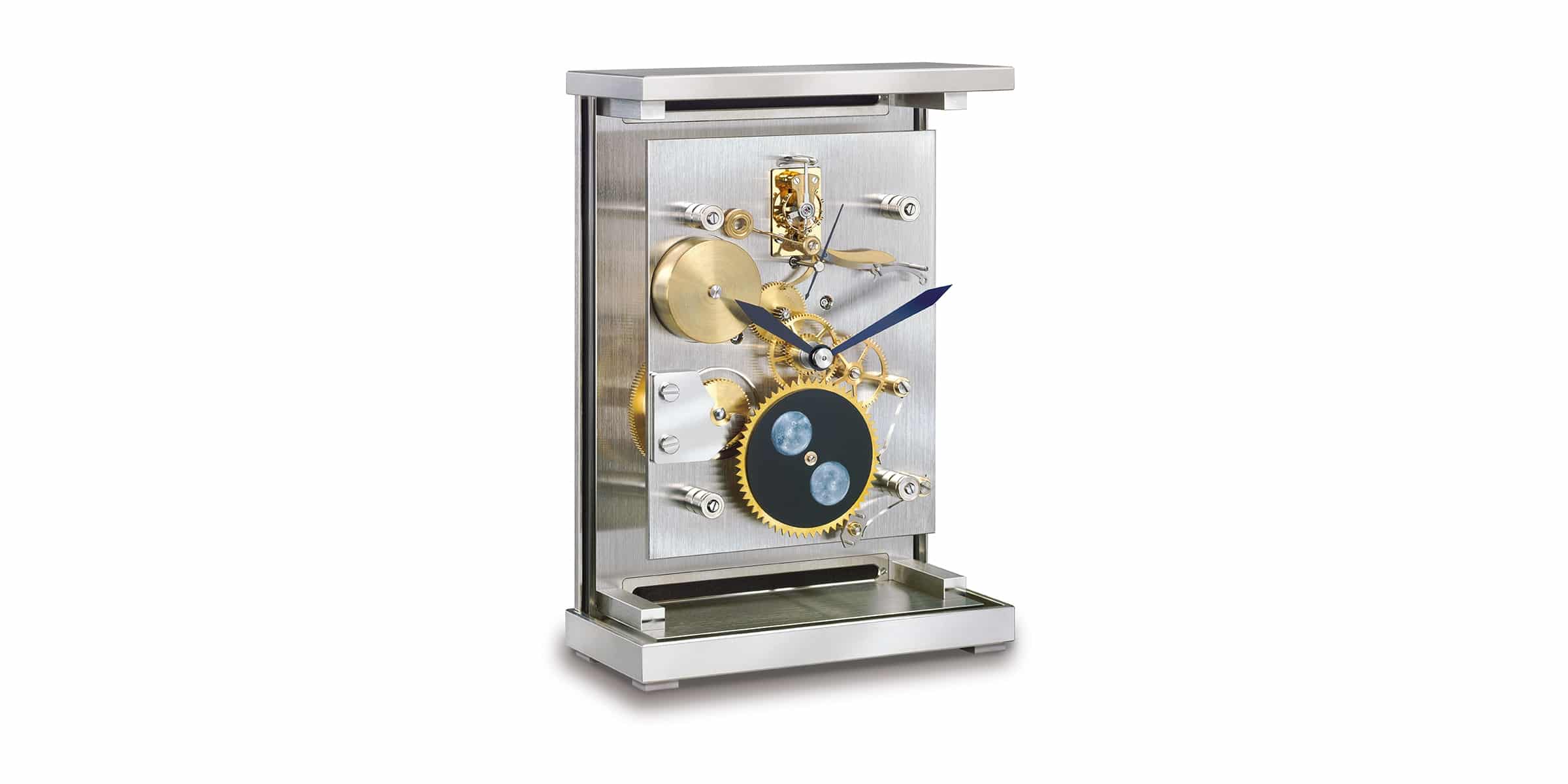Ihre Ausgewogenheit in Konstruktion und Erscheinung macht die Lunaris Tischuhr zu einem wahren Schmuckstück aus dem Hause Erwin Sattler.