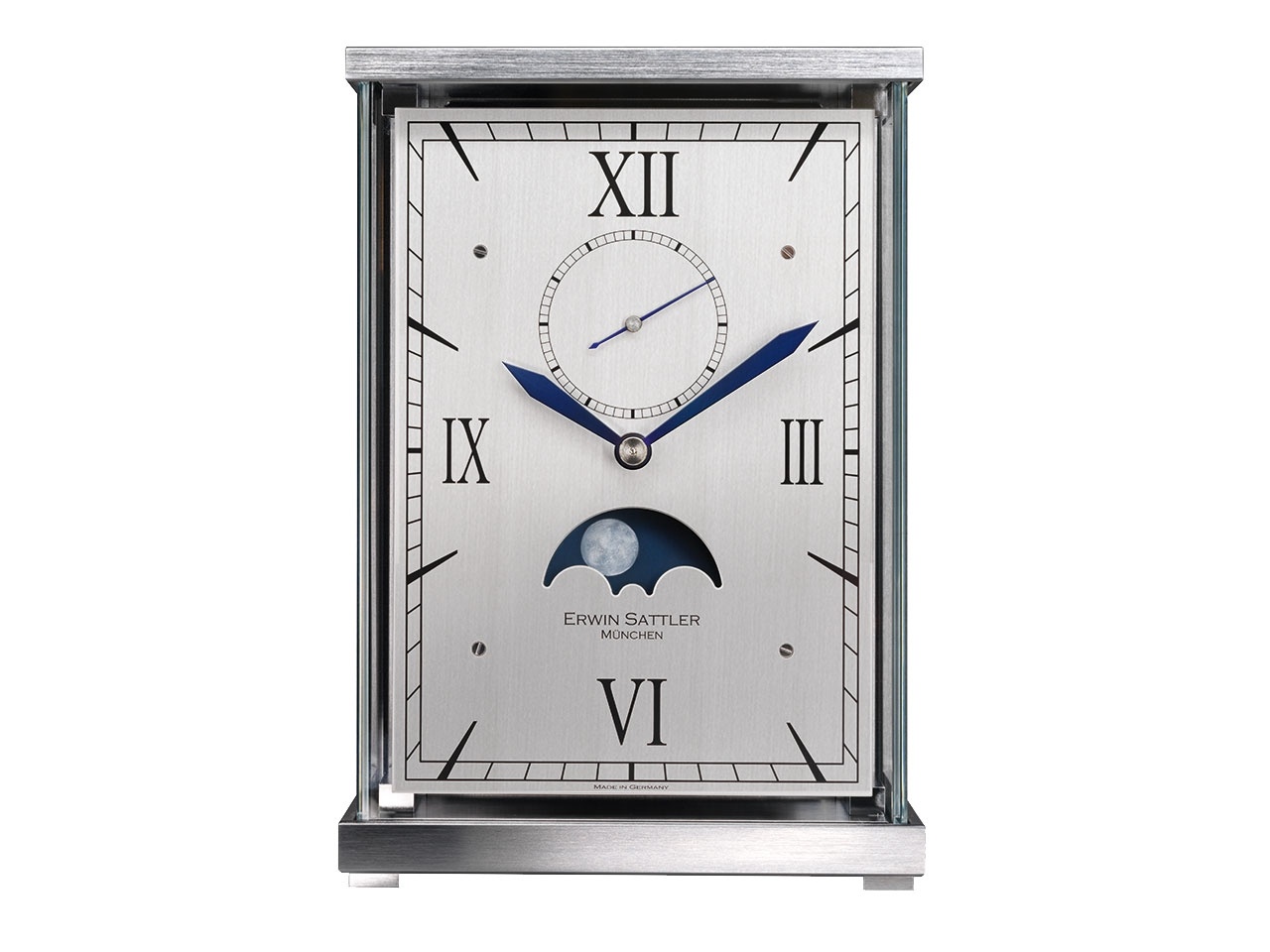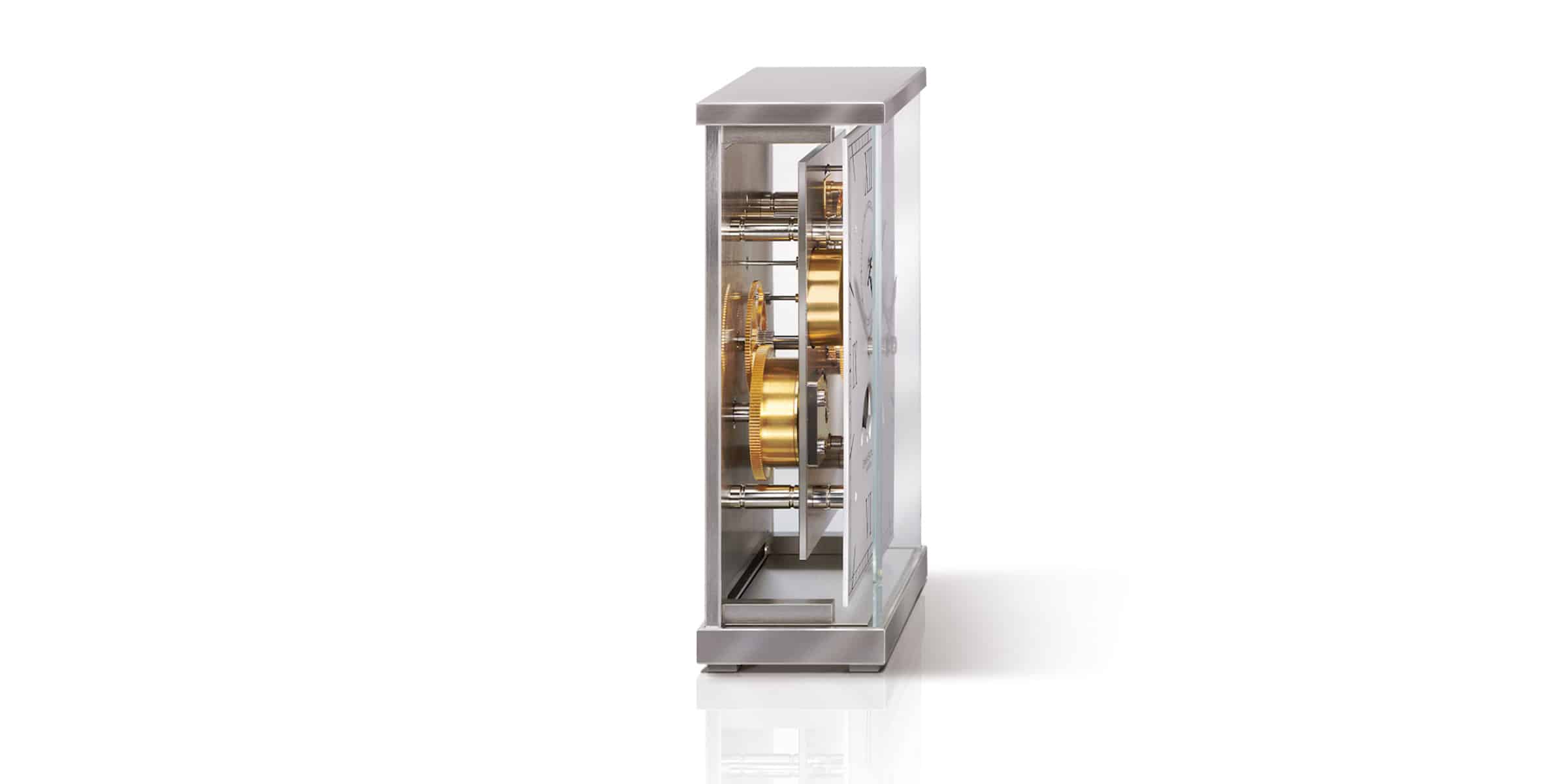 Ihr auf den ersten Blick aufsehenerregendes Design verdankt die Tischuhr Lunaris von Erwin Sattler dem rahmenlosen Gehäuse aus Glas und den geschliffenen, verchromt Messing-Frästeilen, die den Korpus kunstvoll umrahmen. Die Besonderheit dabei ist die tragende Funktion, die das Äußere der Uhr übernimmt. Aus Uhrwerk und Gehäuse wird eine Symbiose, die dem Gesamtwerk eine einzigartige optische Zusammengehörigkeit verleiht.