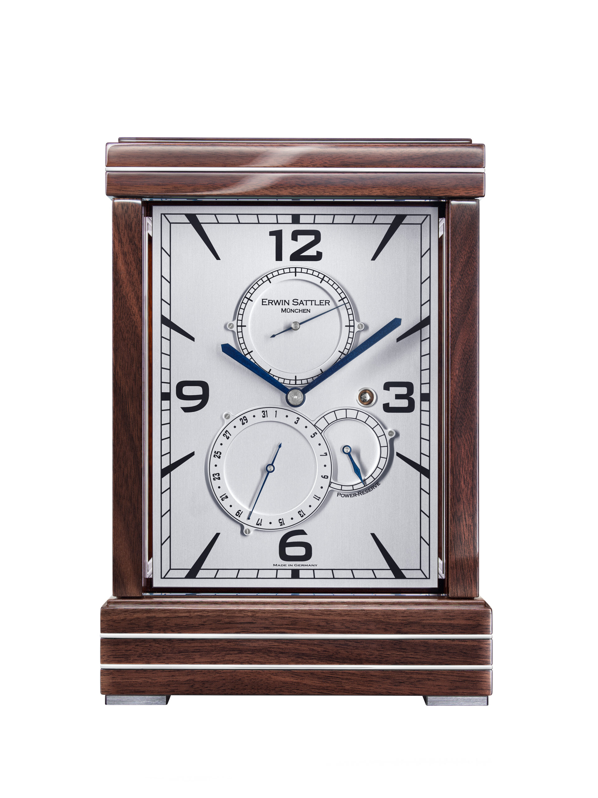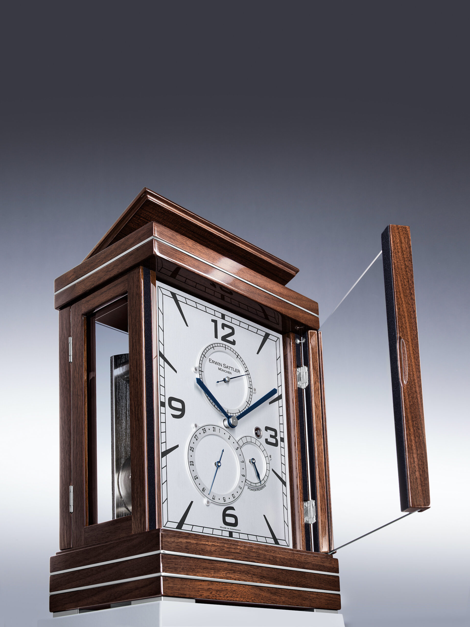 GERADE LINIEN, HOCHGLANZ POLIERTE FLÄCHEN UND EIN MODERN GESTALTETES ZIFFERBLATT LASSEN DIESE TISCHUHR VON ERWIN SATTLER IN JEDEM RAUM GLÄNZEN.