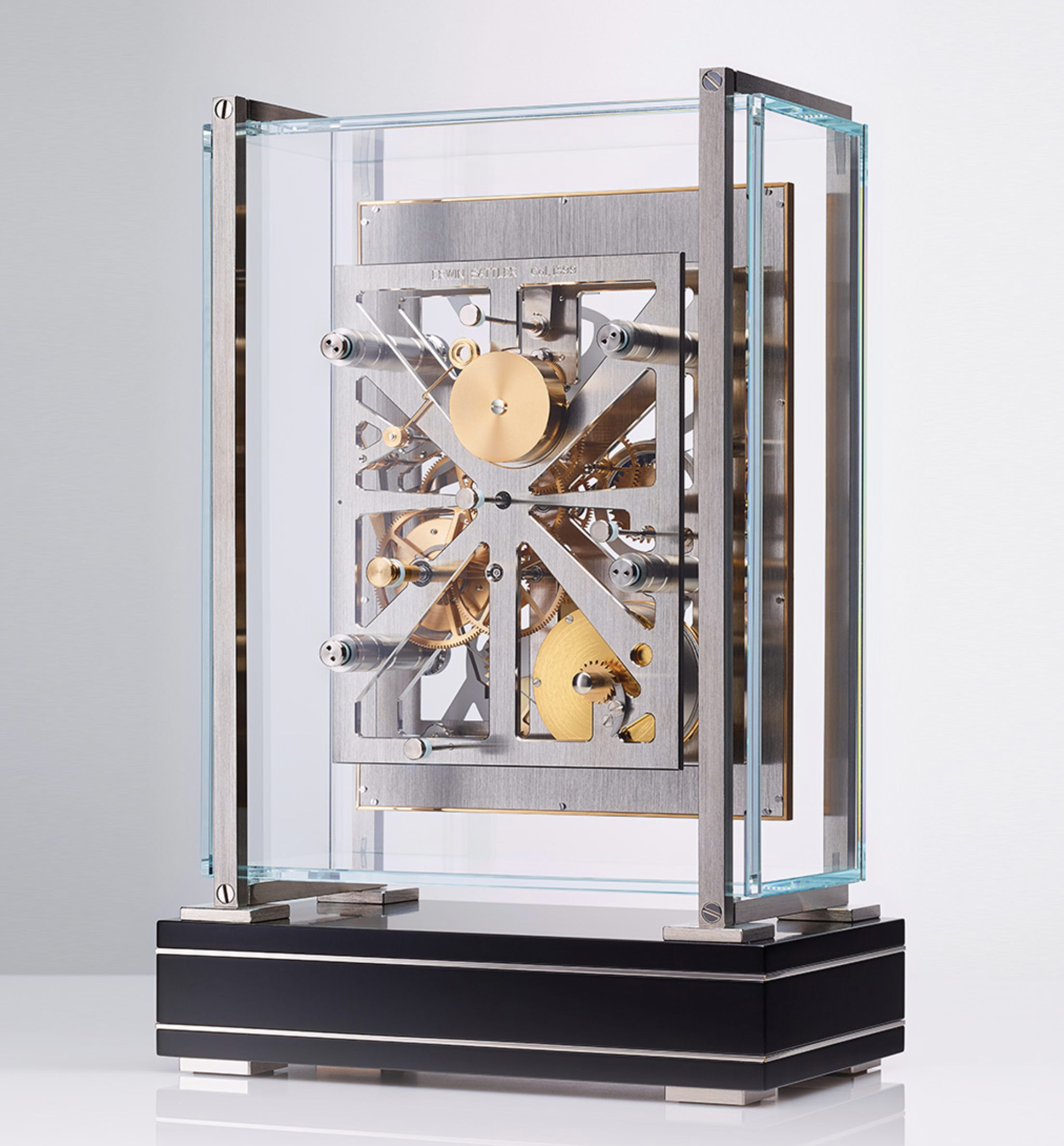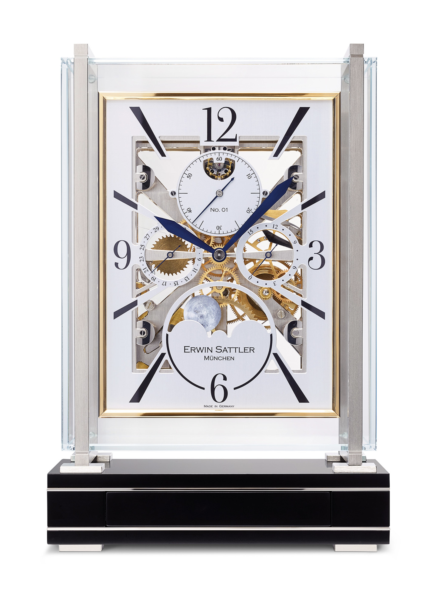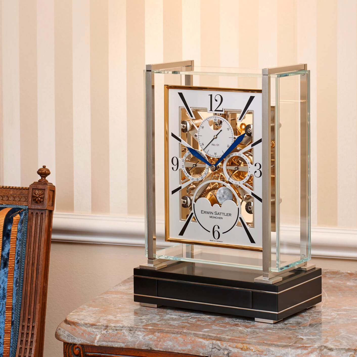 Als Schreibtisch- oder Kaminuhr, ob im Büro oder umgeben von wertvollen Gemälden, die Tischuhr Opera von Erwin Sattler eignet sich hervorragend als funktionales Accessoire. Das Uhrwerk wird nur durch Glas geschützt. So gewährt sie einen freien Einblick in das Uhrwerk mit den feinen Zahnrädern. Auf einem, mit Metallintarsien ausgestatteten, schwarzen Holzsockel wird die Glaskonstruktion nur von vier verchromten Messingleisten gehalten und erweckt so den Eindruck, als würde sie schweben.