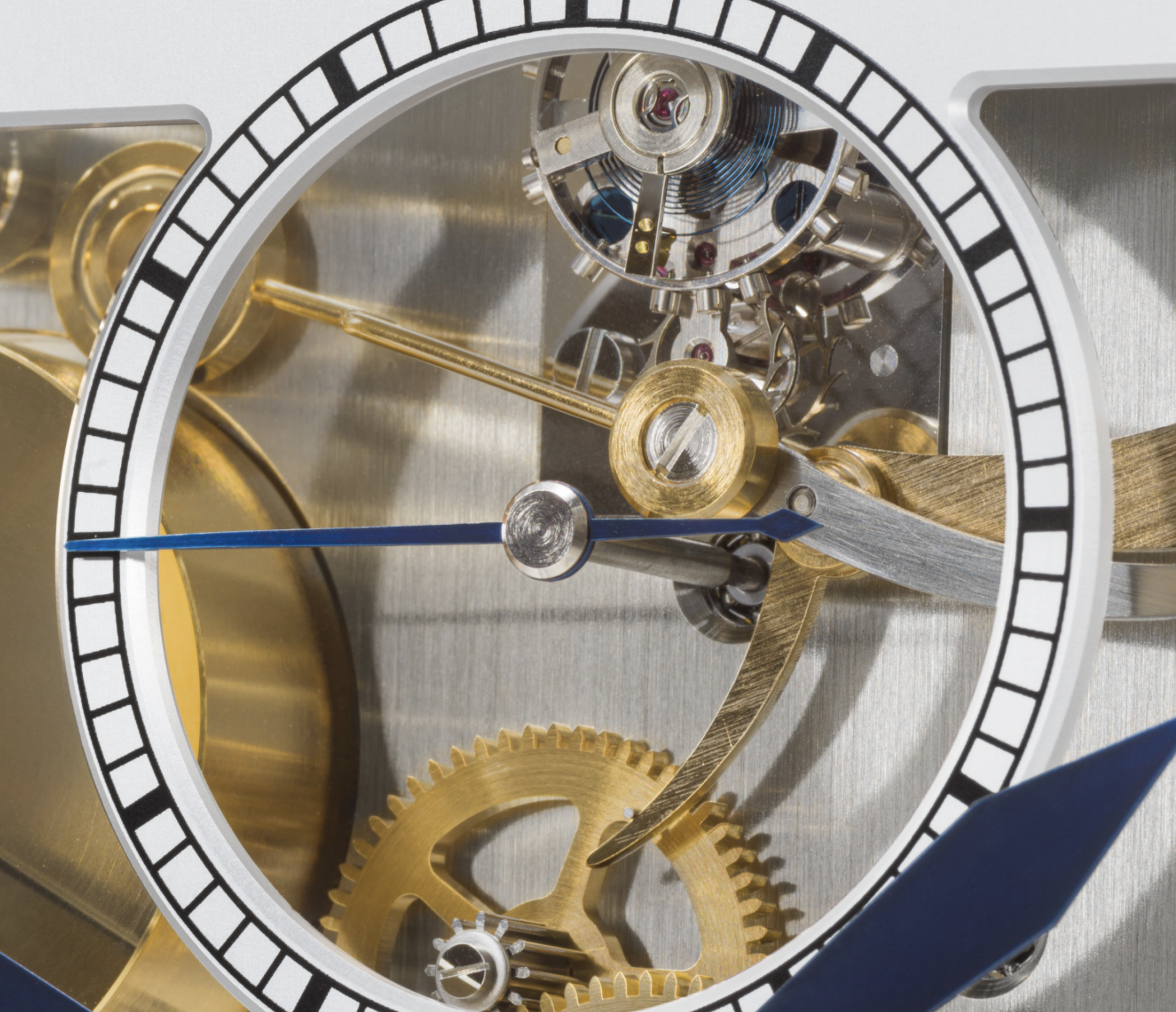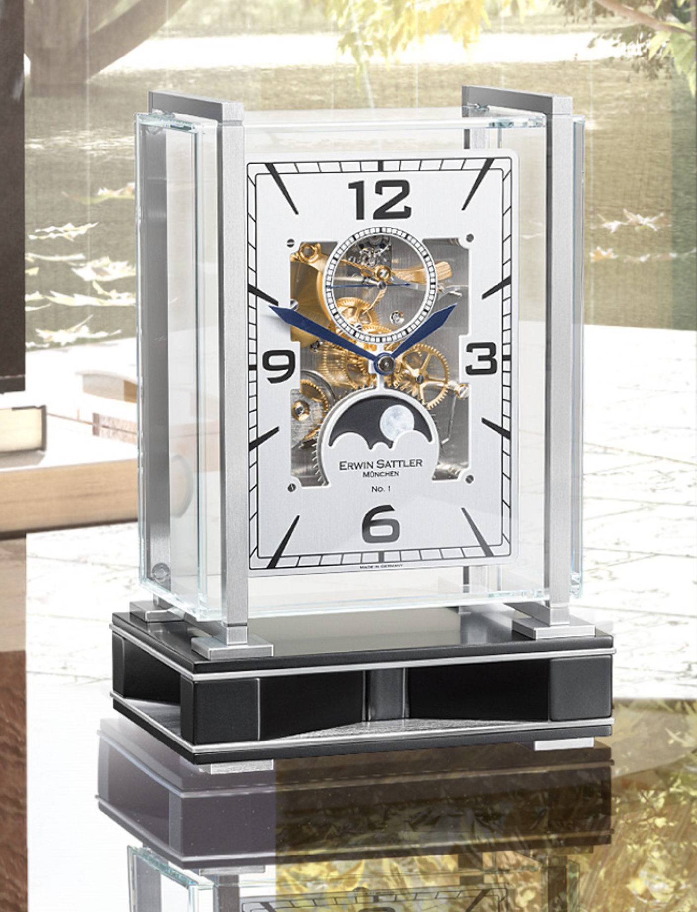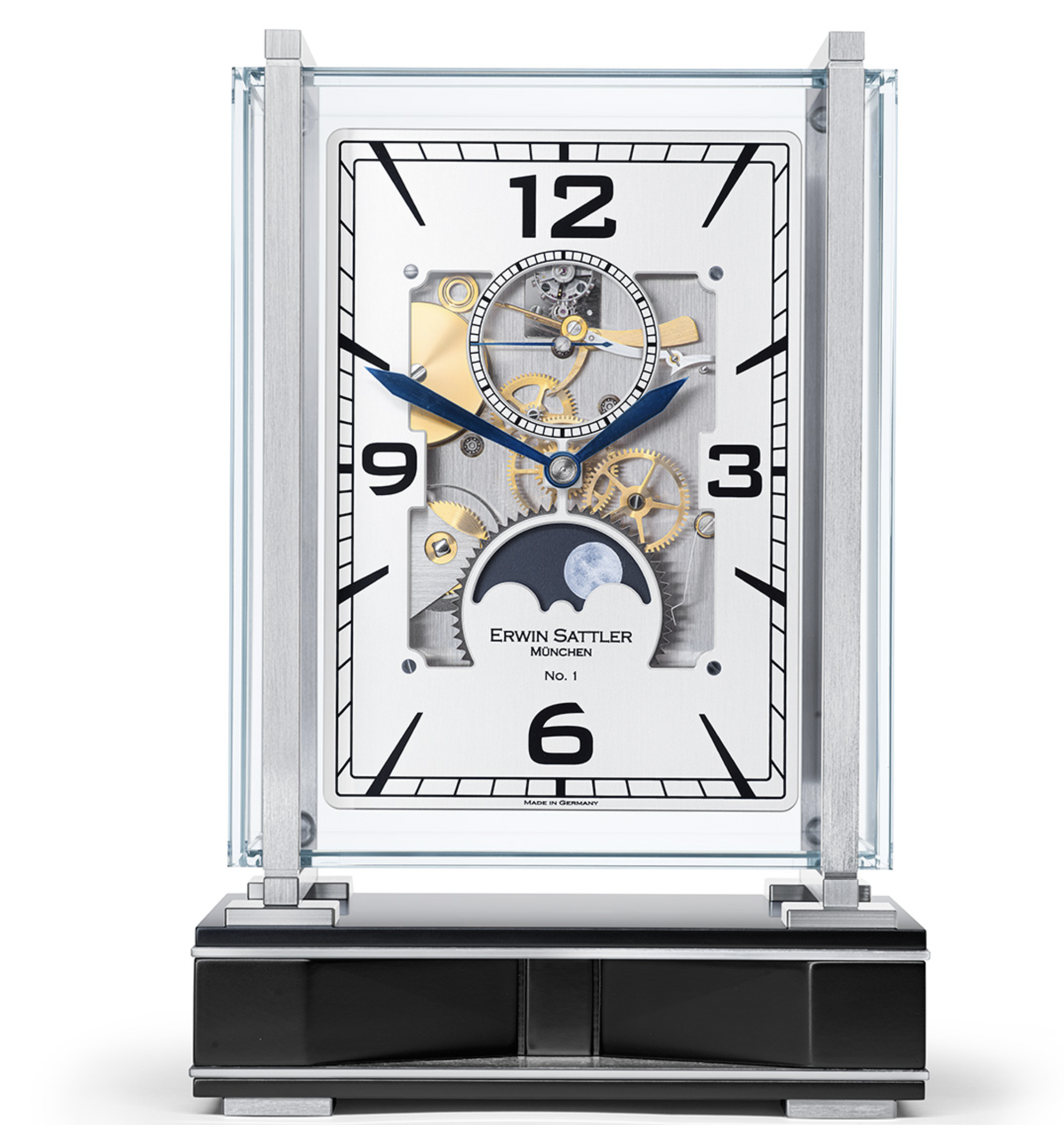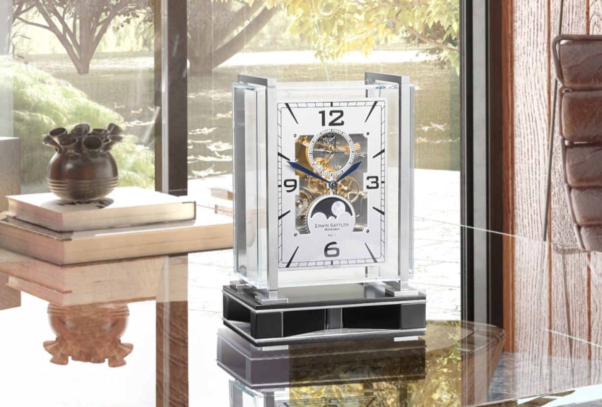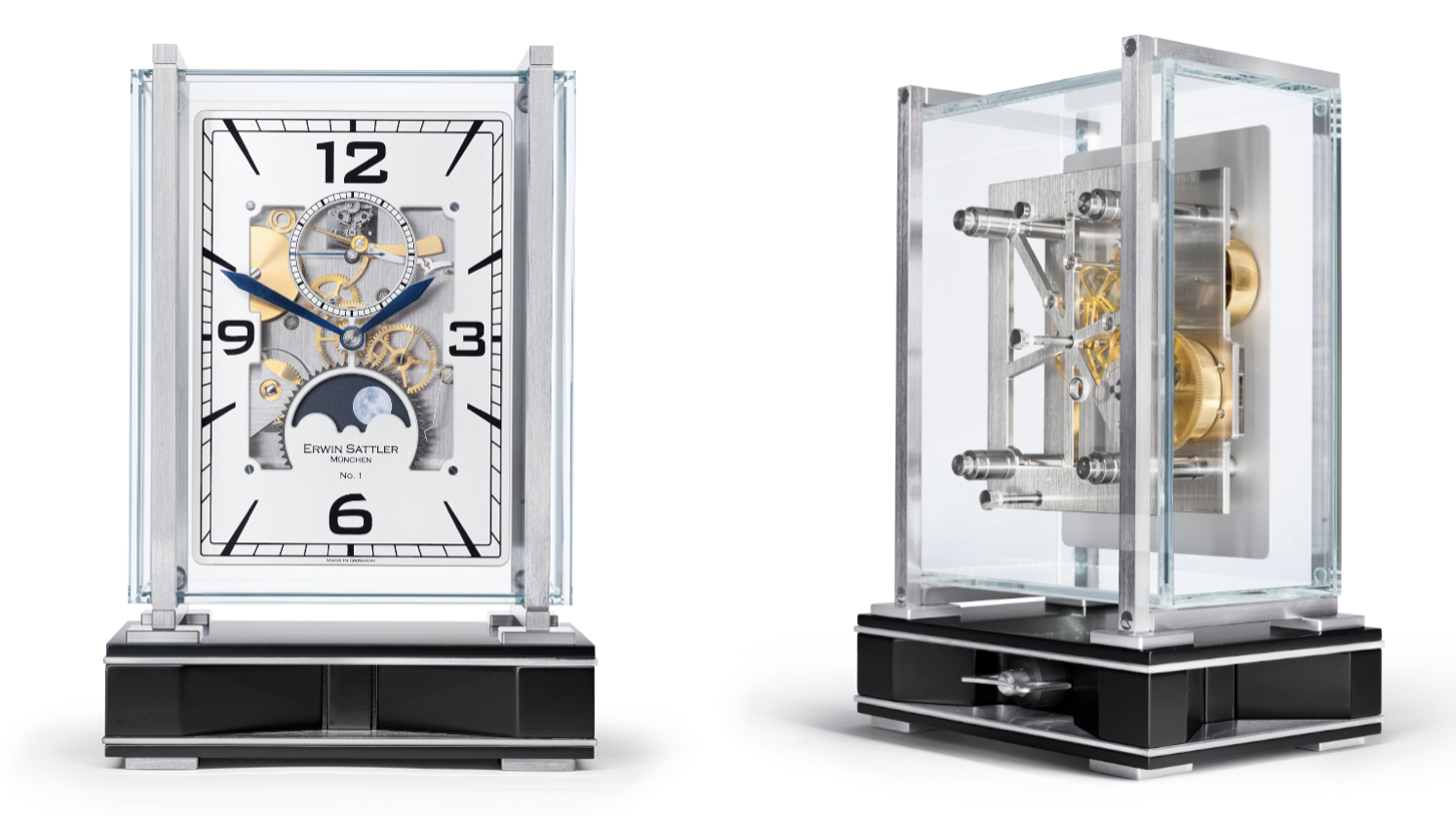 Die neue Tischuhr Operetta von Erwin Sattler gestattet durch sechs Glasscheiben den ungehinderten Blick in jeden Winkel ihres Innersten. Und auch der Uhrenklang ist von höchster Qualität. Ein feiner Schlag „im Vorübergehen“, im Französischen „en passant“, also der Passageschlag, ertönt zu jeder vollen Stunde und vervollständigt, ebenso wie die handbemalte Mondscheibe diese uhrmacherische Komposition.