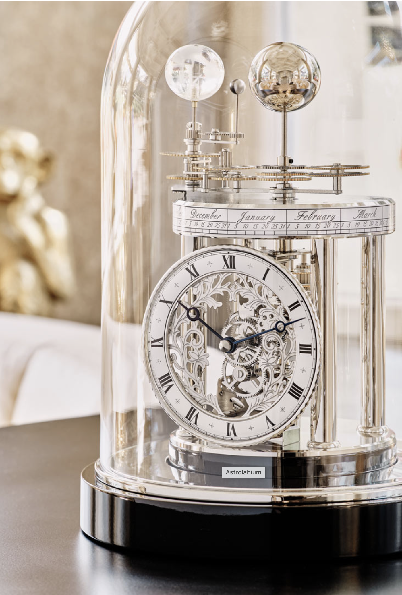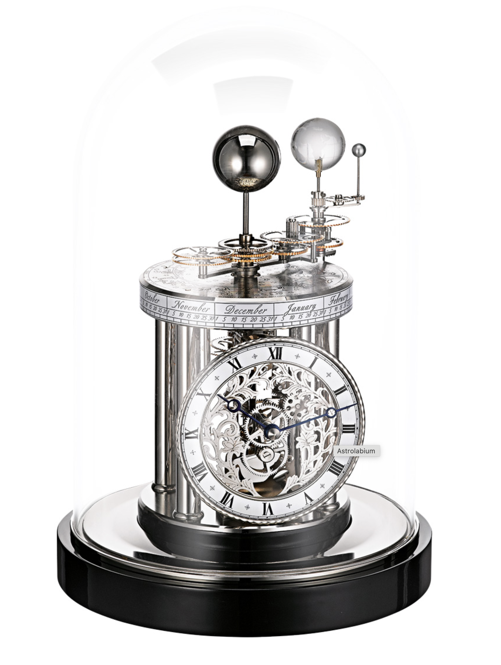 Das quartzgesteuerte Hermle Skelettwerk mit astronomischen Indikationen trägt als oberen Abschluss in Ergänzung zur Stunden- und Minutenanzeige ein Astrolabium 22836-072987 in Mahagoni. Sonne, Mond und Erde werden vom Uhrwerk über das oben sichtbare Räderwerksgetriebe in ihrer täglichen, monatlichen (Mond um die Erde) und jährlichen Umdrehung (Erde um die Sonne) im naturgetreuen Zeitablauf bewegt.
