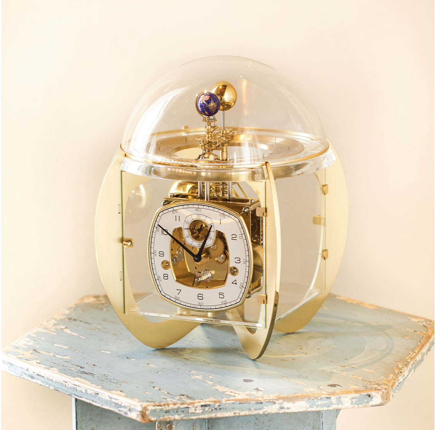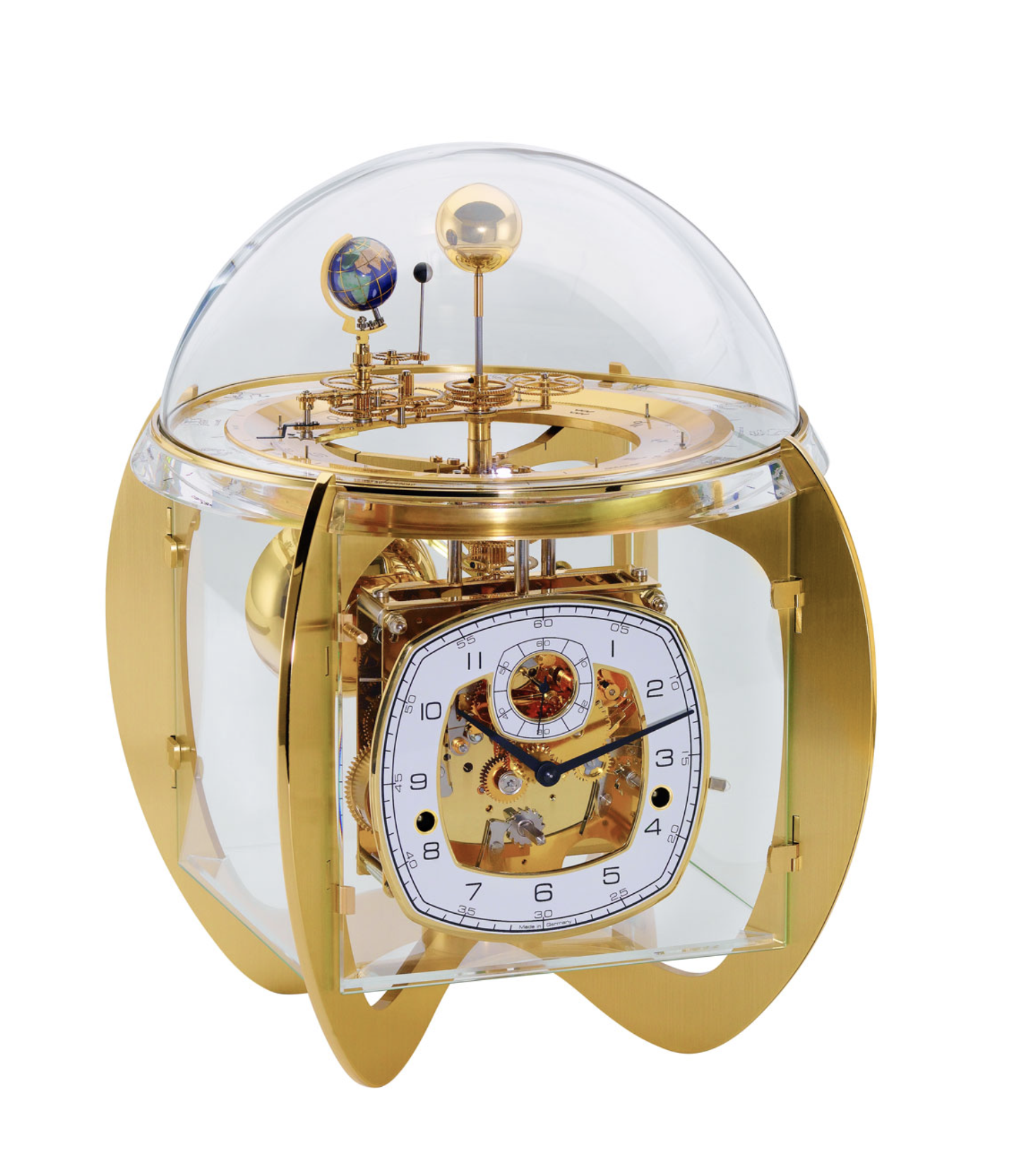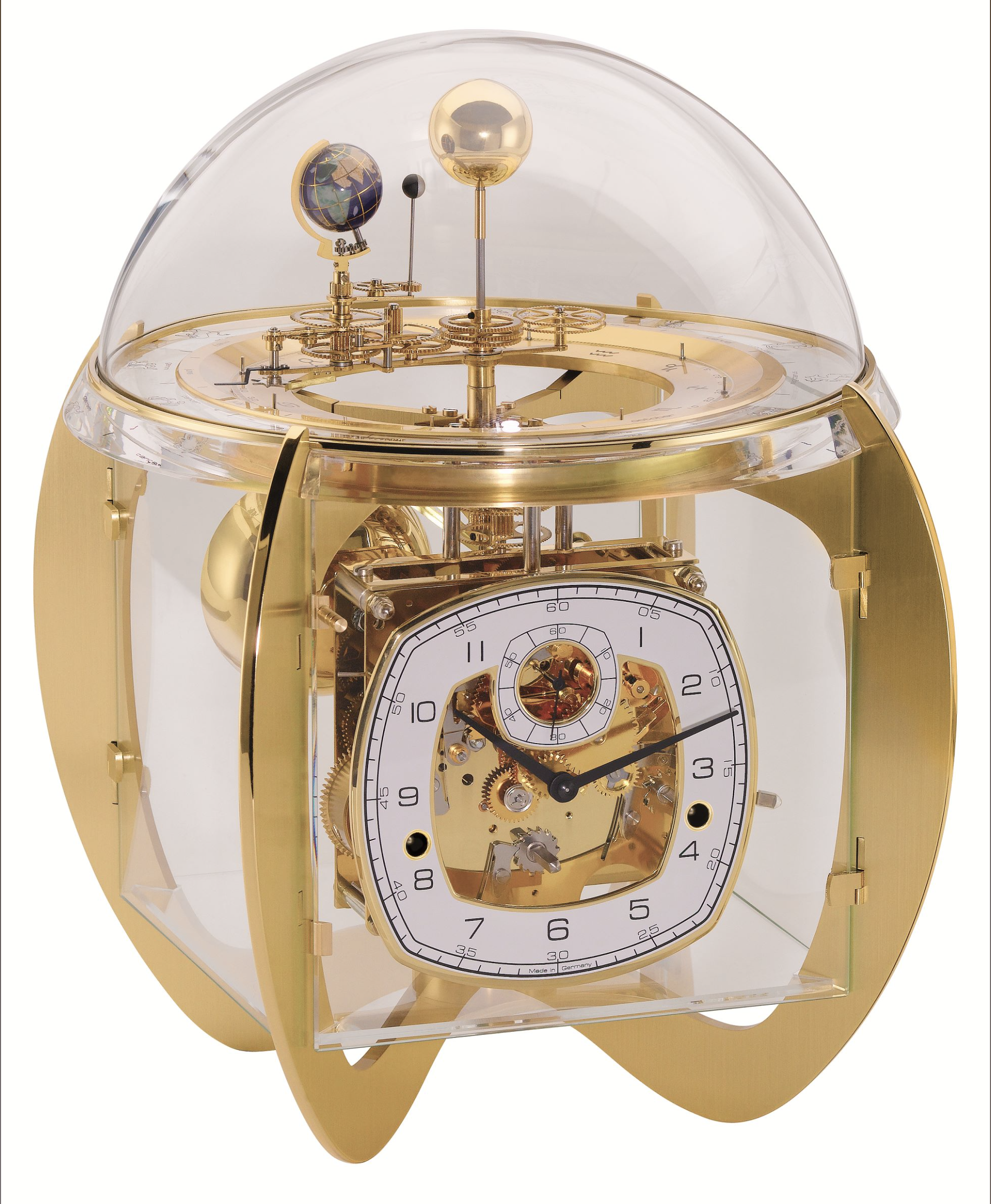 Das Designstück von Hermle zeigt einmal den Umlauf der Erde um die Sonne innerhalb eines Jahres, wobei sich die Erde alle 24 Stunden einmal um sich selbst dreht. Gleichzeitig umkreist der Mond alle 29 1/2 Tage einmal die Erde und dreht sich dabei einmal um die eigene Achse, so dass von der Erde aus die einzelnen Mondphasen zu erkennen sind. Die Erde durchläuft dabei die 12 Tierkreiszeichen, die Monate und Tage, die auf einem flachen Zifferblatt abgelesen werden können. 8-Tage 4/4 Westminster-Schlagwerk auf vier polierten Glocken. Sekunde im Kraftfluss, Federzug, 11-steiniges Schweizer Echappement, polierte Platinen, automatische Nachtabschaltung des Schlagwerks. Tellurium-Dreharm mit Zeiger und Darstellung von Sonne, Mond und Erde.