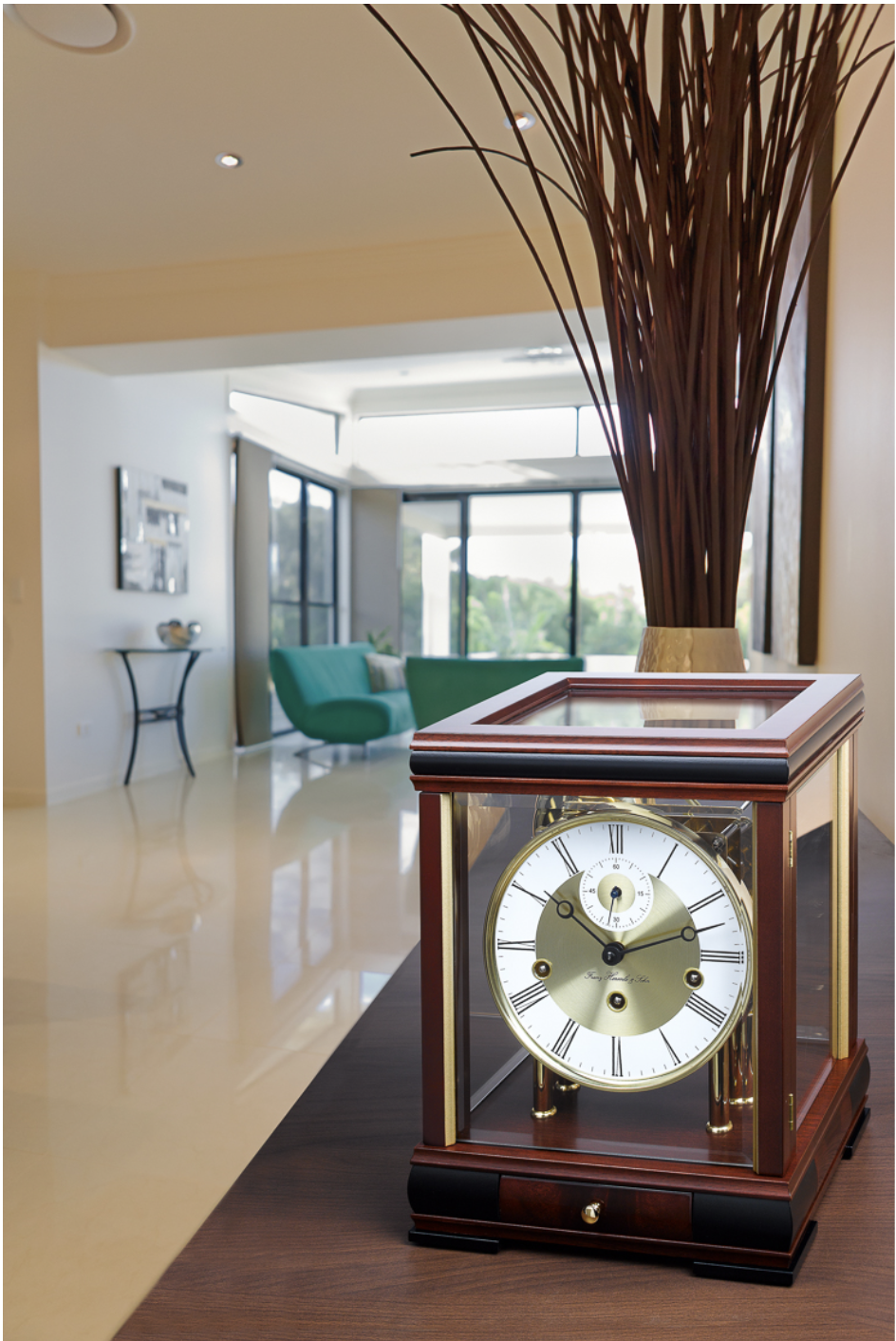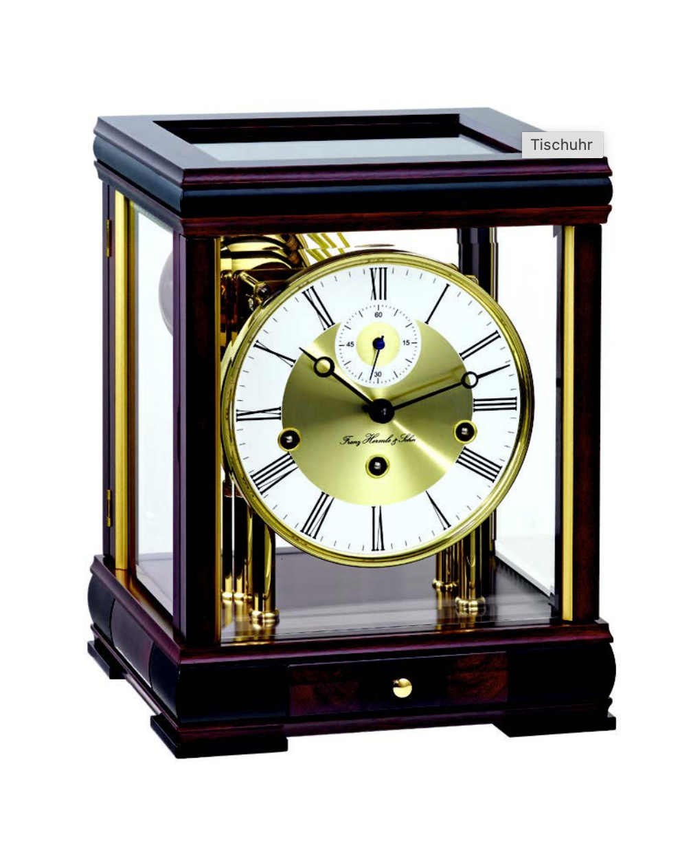 Ein neues klassisches Highlight aus der Hermle Kollektion ist diese zeitlos elegante Tischuhr 22998-070352 aus edlem Mahagoni. Diese Uhr bietet mit seiner völligen Transparenz einen eindrucksvollen Einblick auf das Hermle Westminster-Schlagwerk W0352 mit dem harmonisch gold-weißen Zifferblatt-Design.
