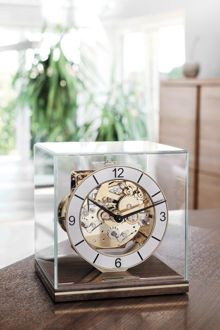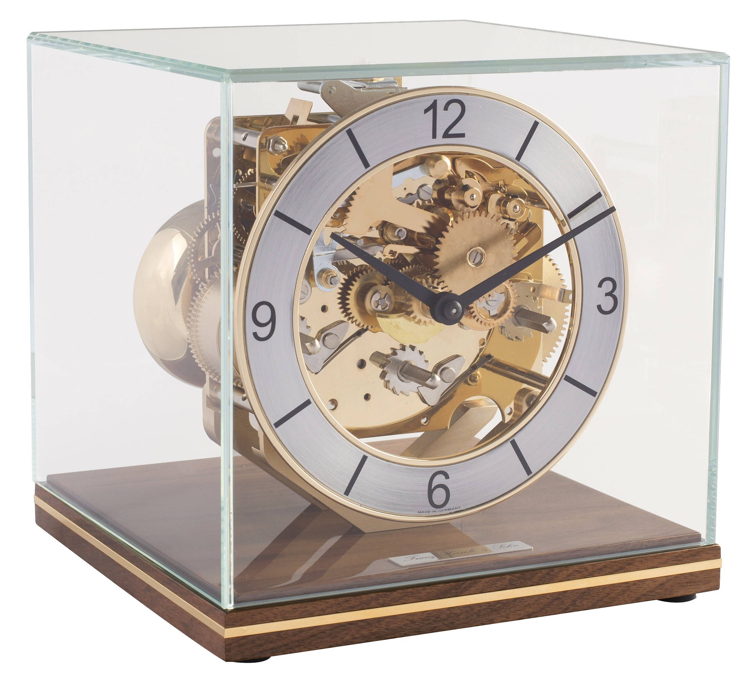 Neuartige Hermle Tischuhr 23052-030340 in Nussbaum. Die minimalistisch kubische Grundform dieser Uhr eignet sich hervorragend für die freistehende Positionierung im Raum. Der Sockel zeichnet sich besonders durch die feine Schleiflackoberfläche, sowie durch die eingelegte, polierte Metallader aus. Zifferblatt aus Messing massiv, poliert, Zahlenreif geschliffen mit modernen arabischen Zahlen bedruckt.