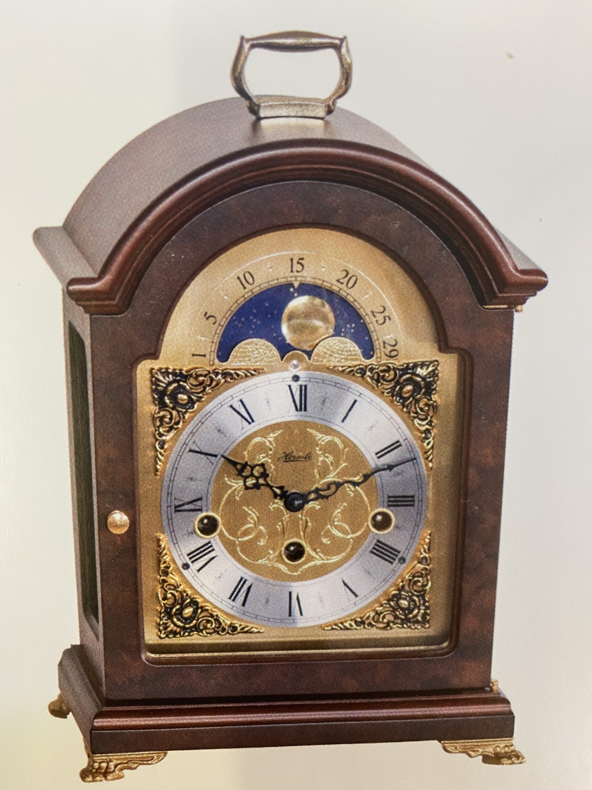 Englische Tischuhr 23054-030340 von Hermle in hochwertigen Holzgehäuse mit Nussbaum-Finish. Seitengläser, Rücktür mit Scharnier, geätztes Mondphasenzifferblatt mit aufgelegten Eckapplikationen. 8 Tage Werk mit 4/4 Westminster-Schlagwerk mit automatischer Nachtabschaltung.