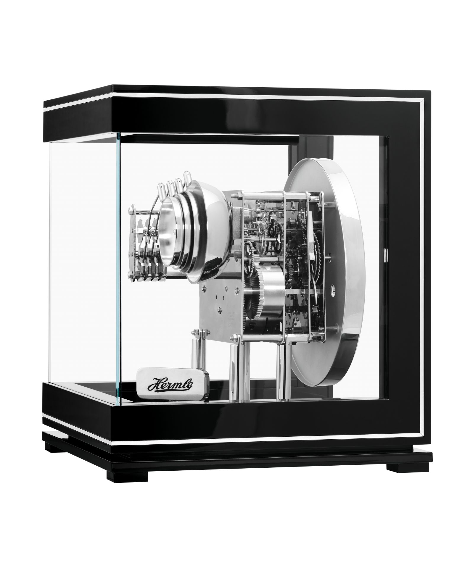 Der neu aufgelegte Ewige Kalender ist mit dem hochglanzpolierten Westminsterwerk W0352 ausgestattet, welches alle acht Tage aufgezogen werden muss. Dieses Westminsterschlagwerk schlägt alle 15 Minuten, zur vollen Stunde die Anzahl der Uhrzeit und kann bei Bedarf nachts Dank der automatischen Nachtabschaltung ausgeschaltet werden (letzter Schlag 21:45 Uhr, nächster 7:00 Uhr). Der dezente Klang der Glocken sorgt für ein angenehmes Wohlbefinden in Ihren Räumlichkeiten. Der neue Aufzugsschlüssel des Ewigen Kalenders ist in Chrom lackiert und befindet sich raffiniert vertieft hinter dem mechanischen Uhrwerk. Aufgrund der entspiegelten Glasfronten ist das Uhrwerk von allen Seiten bestens einsehbar. Ein weiteres Highlight dieser Uhr ist der Kubus, welcher zum Aufziehen des Uhrwerks nach oben entnommen werden muss.