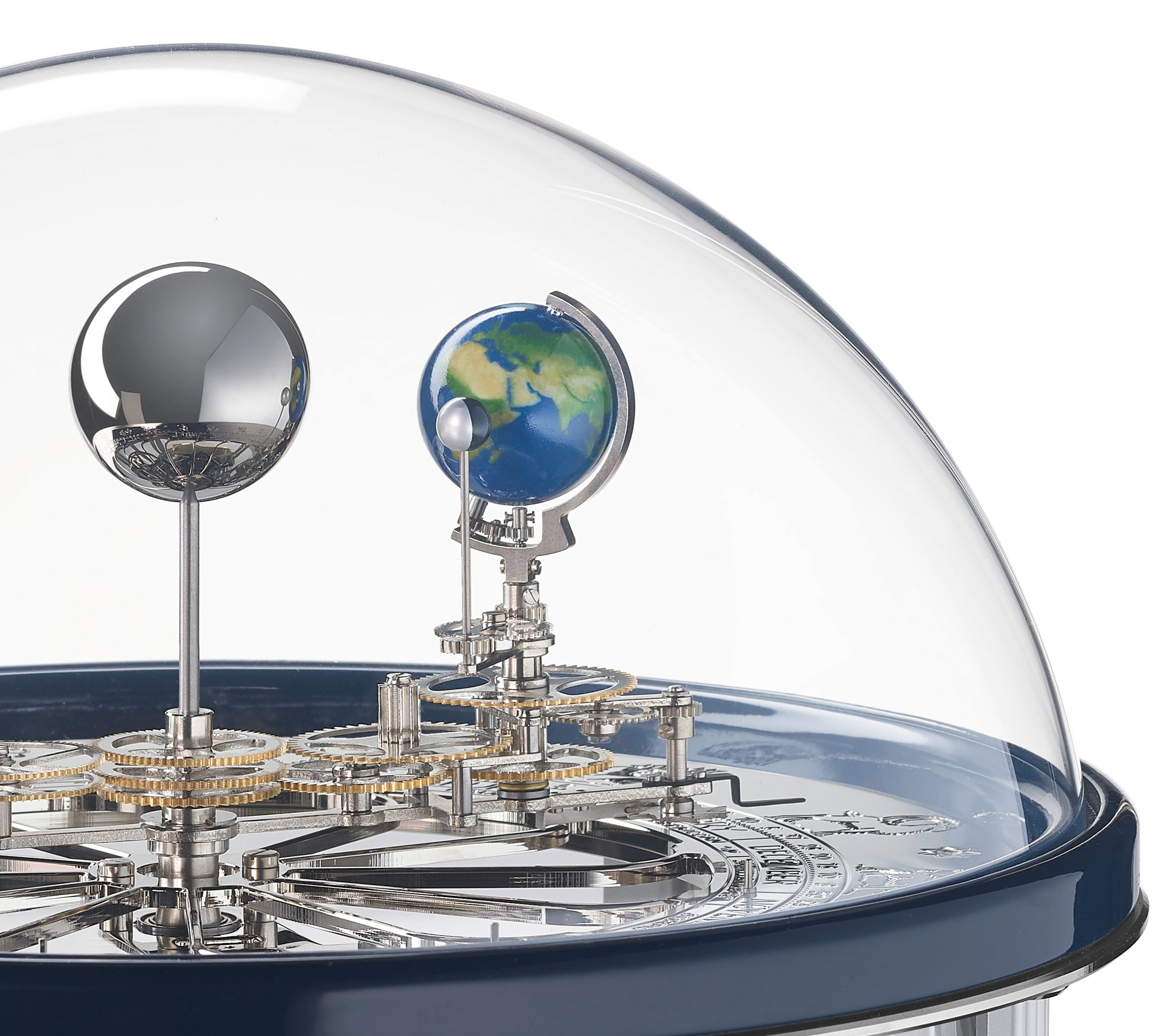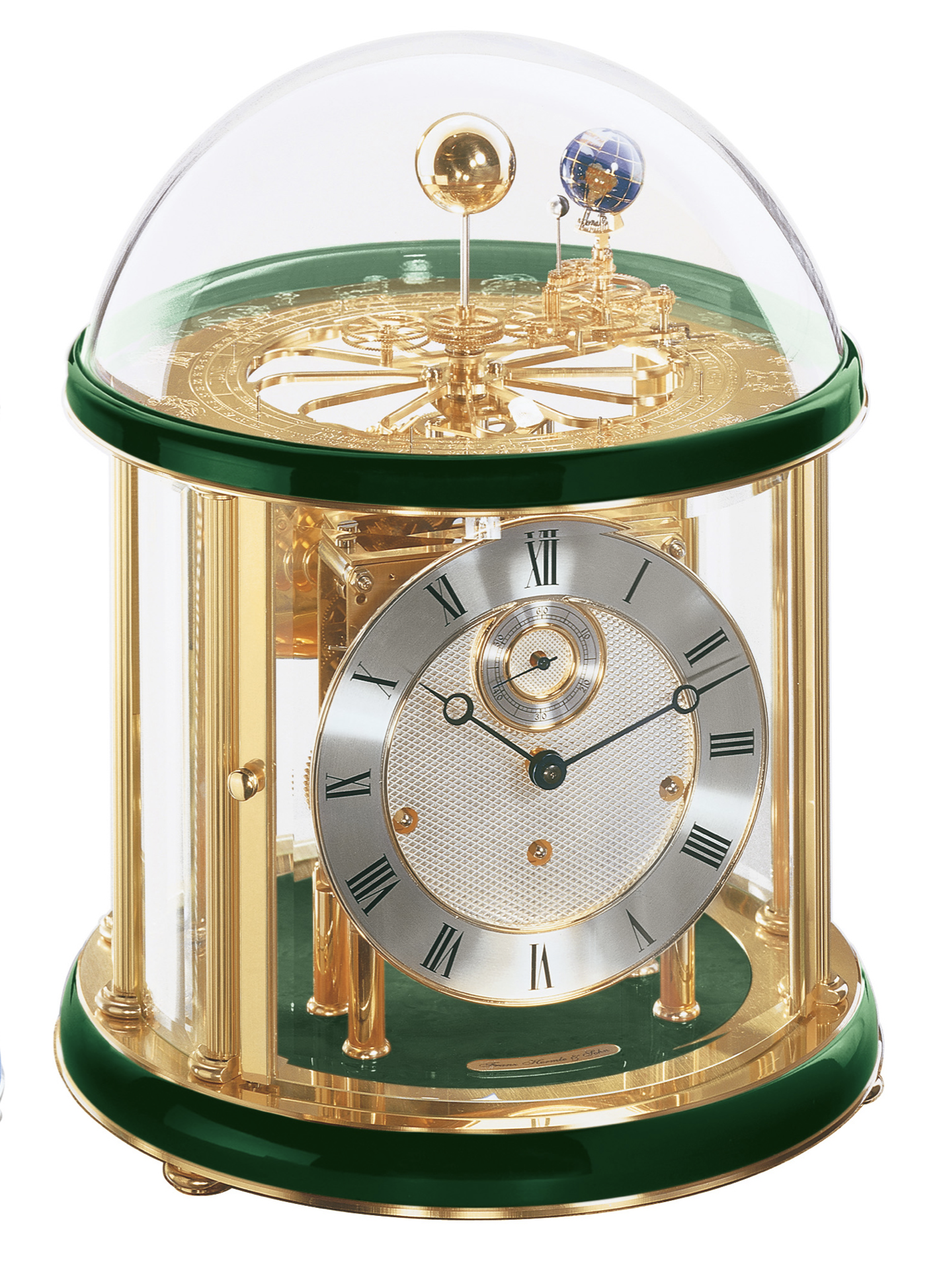 Das Tellurium 22805-V10352 in Messing/Grün von Hermle zeigt einmal den Umlauf der Erde um die Sonne innerhalb eines Jahres, wobei sich die Erde alle 24 Stunden einmal um sich selbst dreht. Gleichzeitig umkreist der Mond alle 29 1/2 Tage einmal die Erde und vollführt dabei eine Rotation um die eigene Achse, wodurch von der Erde aus die einzelnen Mondphasen erkennbar sind. Die Erde durchläuft dabei die 12 Tierkreiszeichen, die Monate und Tage, die auf einem flachen Zifferblatt abgelesen werden können. Das Uhrwerk der Tellurium 22805-V10352 von Hermle verfügt über 8-Tage 4/4 Westminster- Schlagwerk auf vier polierten Glocken. Sekunde im Kraftfluss, Federzug, 11-steiniges Schweizer Echappement, polierte Platinen, automatische Nachtabschaltung des Schlagwerks. Gefräste Darstellungen der 12 Tierkreiszeichen auf durchbrochener, polierter Rosettenronde. Gefräste Kalenderdarstellung von Monat und Tag. Tellurium-Dreharm mit Zeiger und Darstellung von Sonne, Mond und Erde.