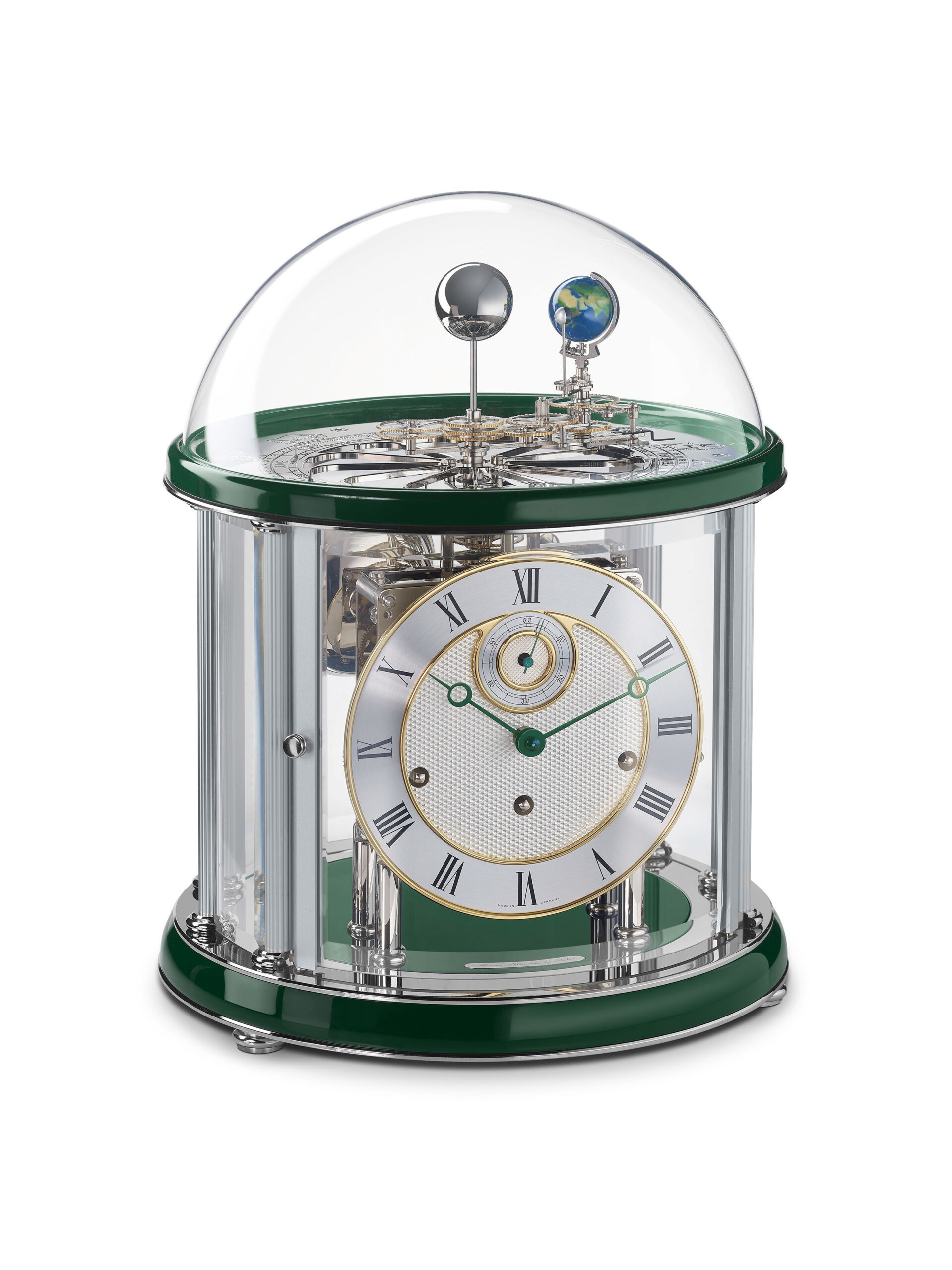Das Tellurium 22823-V10352 in Chrom/Grün von Hermle zeigt einmal den Umlauf der Erde um die Sonne innerhalb eines Jahres, wobei sich die Erde alle 24 Stunden einmal um sich selbst dreht. Gleichzeitig umkreist der Mond alle 29 1/2 Tage einmal die Erde und vollführt dabei eine Rotation um die eigene Achse, wodurch von der Erde aus die einzelnen Mondphasen erkennbar sind. Die Erde durchläuft dabei die 12 Tierkreiszeichen, die Monate und Tage, die auf einem flachen Zifferblatt abgelesen werden können. Das Uhrwerk der Tellurium 22823-V10352 von Hermle verfügt über 8-Tage 4/4 Westminster- Schlagwerk auf vier polierten Glocken. Sekunde im Kraftfluss, Federzug, 11-steiniges Schweizer Echappement, polierte Platinen, automatische Nachtabschaltung des Schlagwerks. Gefräste Darstellungen der 12 Tierkreiszeichen auf durchbrochener, polierter Rosettenronde. Gefräste Kalenderdarstellung von Monat und Tag. Tellurium-Dreharm mit Zeiger und Darstellung von Sonne, Mond und Erde.