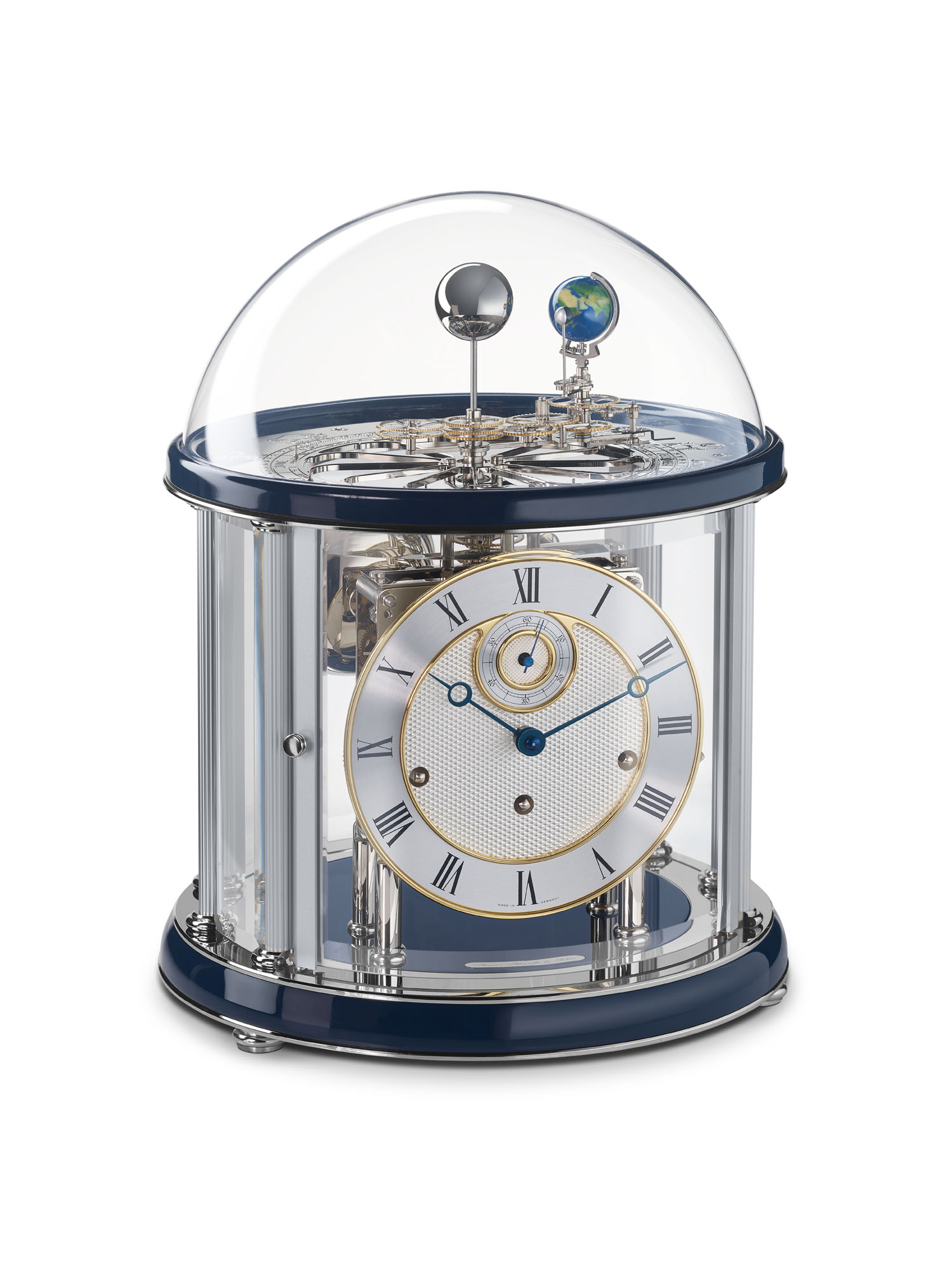 Das Tellurium 22823-V30352 in Chrom/Blau von Hermle zeigt einmal den Umlauf der Erde um die Sonne innerhalb eines Jahres, wobei sich die Erde alle 24 Stunden einmal um sich selbst dreht. Gleichzeitig umkreist der Mond alle 29 1/2 Tage einmal die Erde und vollführt dabei eine Rotation um die eigene Achse, wodurch von der Erde aus die einzelnen Mondphasen erkennbar sind. Die Erde durchläuft dabei die 12 Tierkreiszeichen, die Monate und Tage, die auf einem flachen Zifferblatt abgelesen werden können. Das Uhrwerk der Tellurium 22823-V30352 von Hermle verfügt über 8-Tage 4/4 Westminster- Schlagwerk auf vier polierten Glocken. Sekunde im Kraftfluss, Federzug, 11-steiniges Schweizer Echappement, polierte Platinen, automatische Nachtabschaltung des Schlagwerks. Gefräste Darstellungen der 12 Tierkreiszeichen auf durchbrochener, polierter Rosettenronde. Gefräste Kalenderdarstellung von Monat und Tag. Tellurium-Dreharm mit Zeiger und Darstellung von Sonne, Mond und Erde.