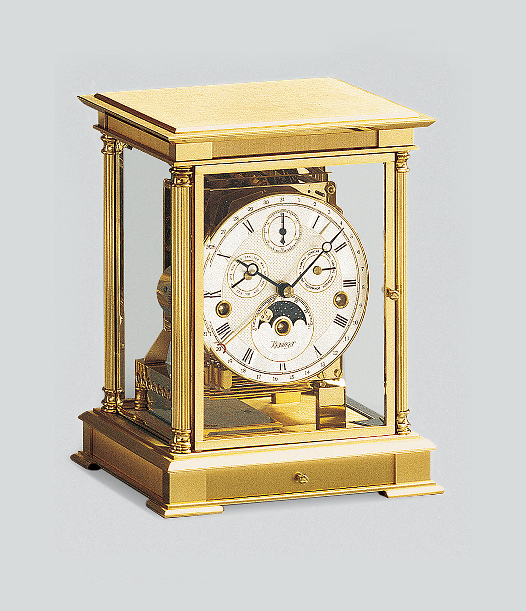 Diese klassische Tischuhr 1240-06-05 aus vergoldetem, massivem Messing von Kieninger besticht durch ihre diamantgefrästen Kanten. Die Uhr verfügt über Kanten und vier Säulen mit Dekorrosetten.