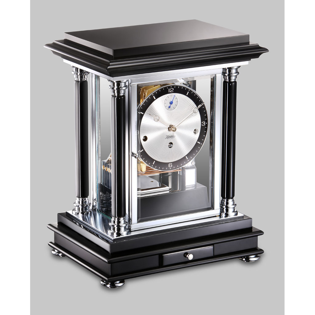 Die klassische Kieninger Tischuhr 1246-96-02 “Fidelio” präsentiert sich in einer aktuellen Optik. Das massive, verchromte Messinggehäuse besticht durch ein edles schwarzes, teilweise poliertes Schleiflack-Finish und dekorative massive Rosetten als Säulenabschluss. Die Uhr verfügt über zwei Türen sowie ein kleines Schlüsselschubfach im Sockel. Facettierte Kristallgläser, ein versilbertes Zifferblatt mit Sonnenstrahlen-Ätzdekor und gefräste Breguet-Zeiger runden das hochwertige Design ab.