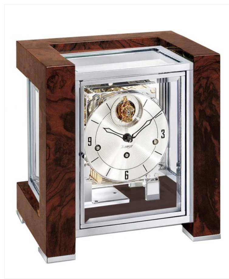 Diese Tischuhr von Kieninger besteht jeweils aus einer aufwendigen verchromten Messing-Rahmenkonstruktion. Ein versilbertes Messingzifferblatt mit geätztem Strahlendekor und ein als Sekundenanzeige fungierendes, hochwertiges Tourbillon mit Schraubenunruh runden das außergewöhnliche Design ab.