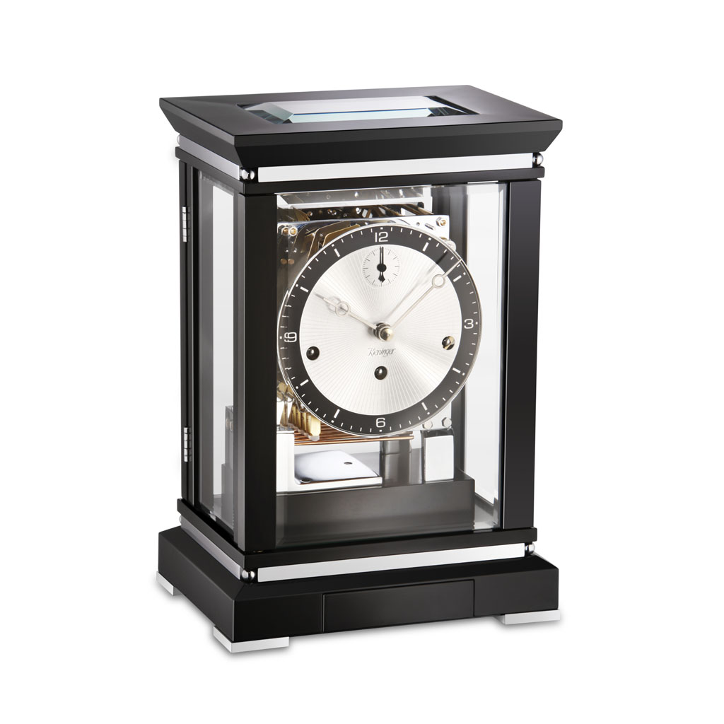 Die Tischuhr 1267-96-02 von Kieninger überzeugt durch ihre hochwertige Verarbeitung und ihr elegantes Design. Das Modell ist in schwarzem Schleiflack gehalten und besticht durch feine, polierte Edelstahl-Akzente im Kopf und Sockel. Alle Gläser sind facettiert. Die Wanduhr verfügt über ein einzigartig versilbertes Zifferblatt mit Sonnenstrahl-Ätzdekor mit 24 cm Durchmesser und einer fein gearbeiteten, offenen ruhenden Hemmung (Graham) mit Kieniramic® Ankerplatten. Des Weiteren verfügt die Uhr über eine Schlüsselschublade im Sockel und Uhrwerk in Chromoptik. Alle sichtbaren Garniturteile sind verchromt.