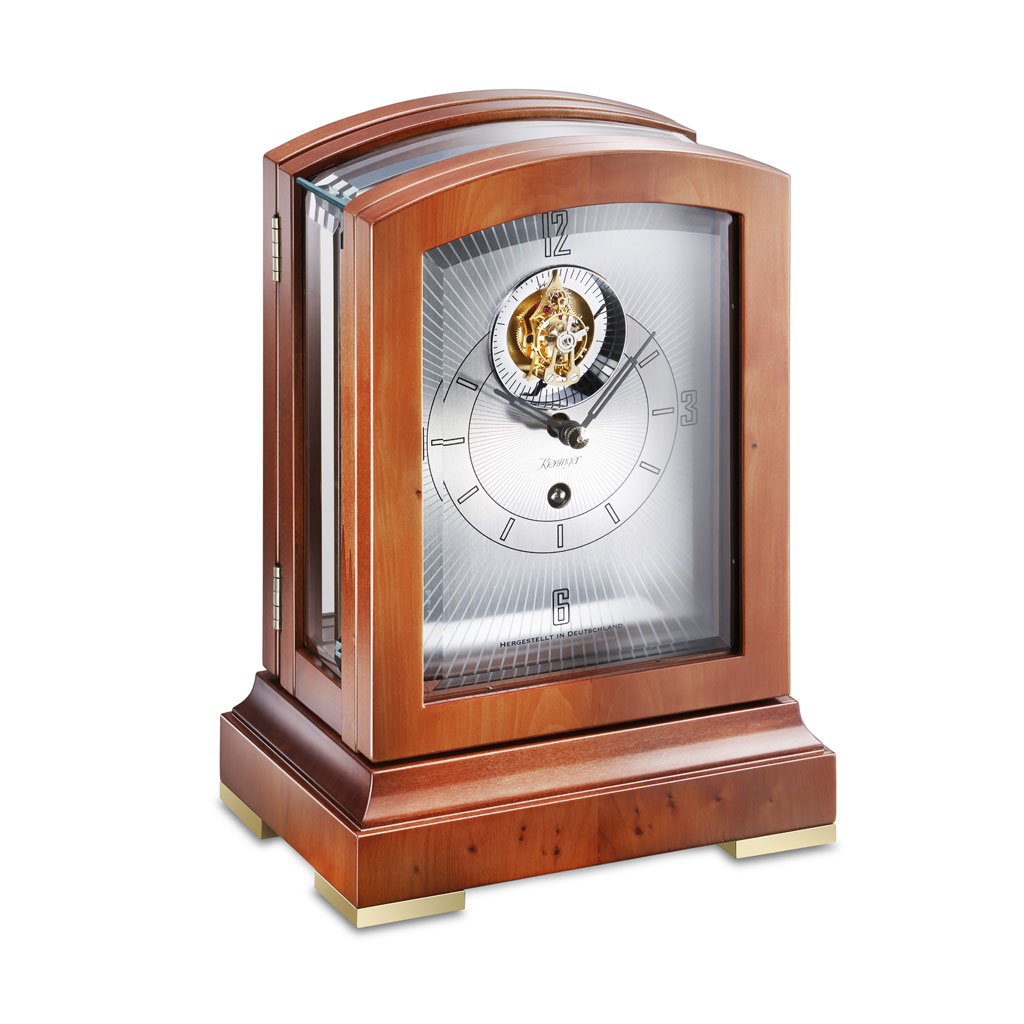 Die Tischuhr 1277-46-01 “Panoramika” von Kieninger verfügt über ein exklusives Kaliber NET01 Tourbillon-Uhrwerk. Der Rahmen und die Türen sind aus Kirschbaum mit Eibe gefertigt und mit zahlreichen facettierten Gläsern kombiniert, sodass ein maximaler Blick auf das Uhrwerk gewährleistet ist.