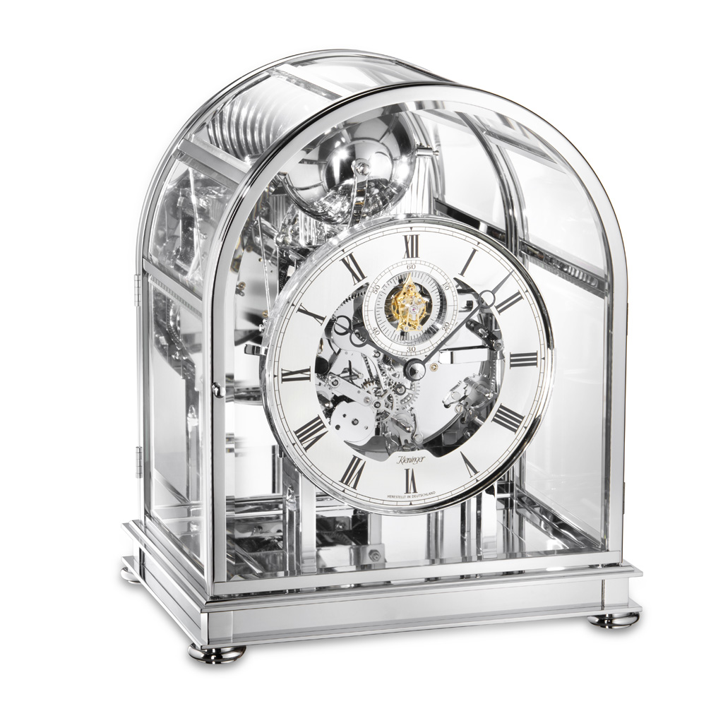 Die moderne Tourbillon-Tischuhr 1709-02-03 “Kupola” von Kieninger aus massivem, aufwendig verchromten Messing besticht durch ihre 7 facettierten und teilweise gebogenen Kristallgläser, welche eine Kuppel über dem edlen Glockenspiel bilden. Die facettierten Gläser in beiden Türen (mit Rückwand und Spiegel) sowie der versilberte offene Zahlenreif mit faszinierendem Tourbillon unterstreichen den hochwertigen Charakter dieser Uhr.