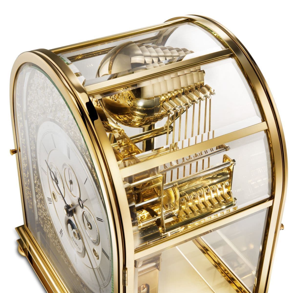 Die Tischuhr 1709-06-01 “Kupola” von Kieninger besticht durch ihre majestätische Erscheinung. Das Modell ist aus massivem Messing gefertigt und mit 24-karätiger Goldauflage veredelt. Ein besonderes Merkmal sind die sieben facettierten und teilweise gebogenen Kristallgläser, die eine Kuppel über dem edlen Glockenspiel bilden. Die Tischuhr verfügt über etagierte Gläser in beiden Türen sowie über ein versilbertes Kalendariumszifferblatt mit Mondphasen-, Sekunden-, Datums-, Wochentags- und Monatsanzeige. Die einzelnen Funktionen lassen sich einfach einstellen. Durch ein 24-karätig vergoldetes offenes Filigrangitter kann das Glockenschlagwerk beobachtet werden.