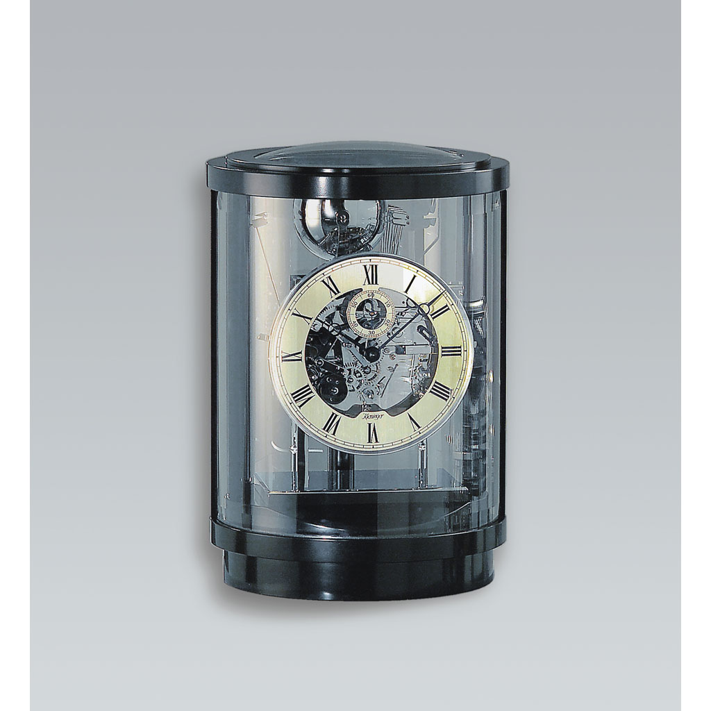 Die repräsentative Tischuhr 1711-96-02 “Akuata” von Kieninger in schwarzem Schleiflack besticht durch ihre komplett runde Grundform. Die gebogenen und facettierten Gläser sowie das gewölbte Glasdach ermöglichen einen vollständigen Blick auf das Messing-Uhrwerk und Glockenspiel. Der offene, versilberte Zahlenreif mit einem Durchmesser von 18 cm und Sekundenanzeige ermöglicht eine präzise Zeitmessung. Das Frontglas lässt sich nach hinten öffnen, indem man es dreht.