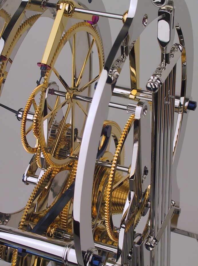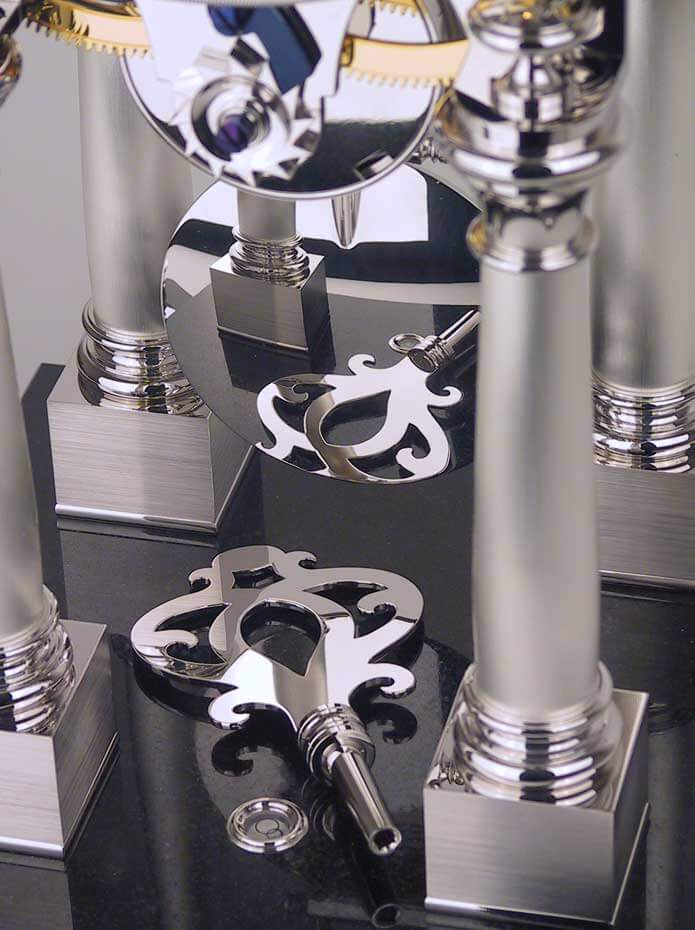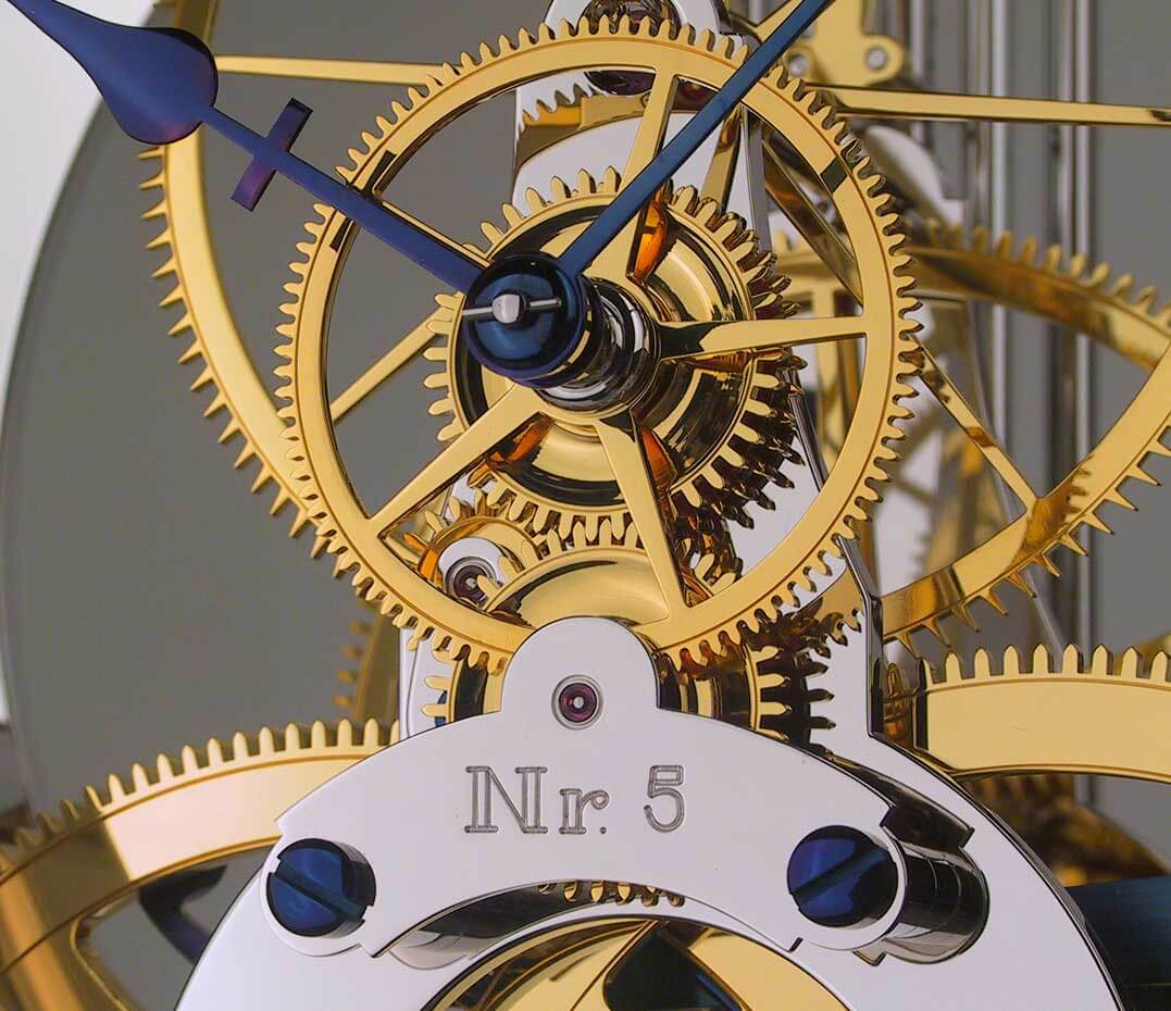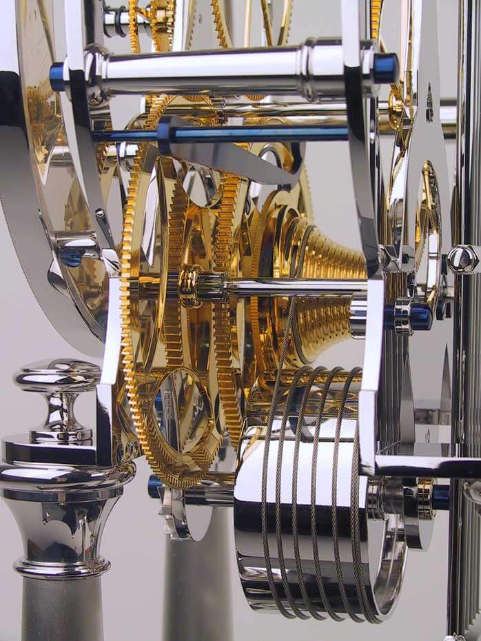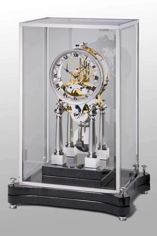 Der kühle Glanz des Rhodiums passt ausgesprochen gut zum tiefen Blau der Zeiger und den zahlreichen Schrauben des Werkes. Montiert auf vier Säulen steht das Werk auf einem massiven Granitsockel der Sorte Nero Assoluto und versprüht seinen beeindruckenden Charme – verbunden mit einer hohen gestalterischen Eleganz.