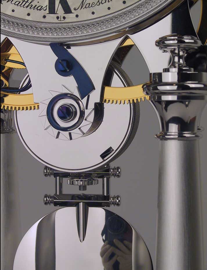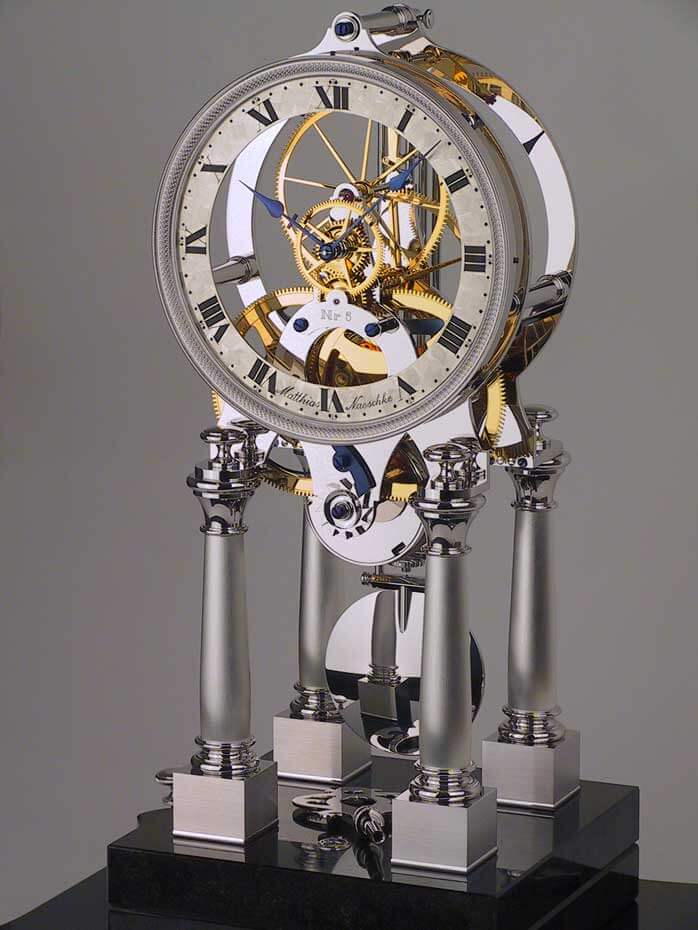 Für Puristen unter den Uhrenliebhabern gibt es die 100 Tage laufende Tischuhr NT 1 GG in der rhodinierten Version NT 1 (RH) von Matthias Naeschke. Technisch identisch mit der NT 1 (GG), sind bei der NT 1 (RH) alle sichtbaren Messingteile des Uhrwerkes, mit Ausnahme der gelb vergoldeten Räder, rhodiniert veredelt. Rhodium ist ein in der Natur sehr selten vorkommendes Metall aus der Platinfamilie und zählt daher zu den teuersten Edelmetallen überhaupt.