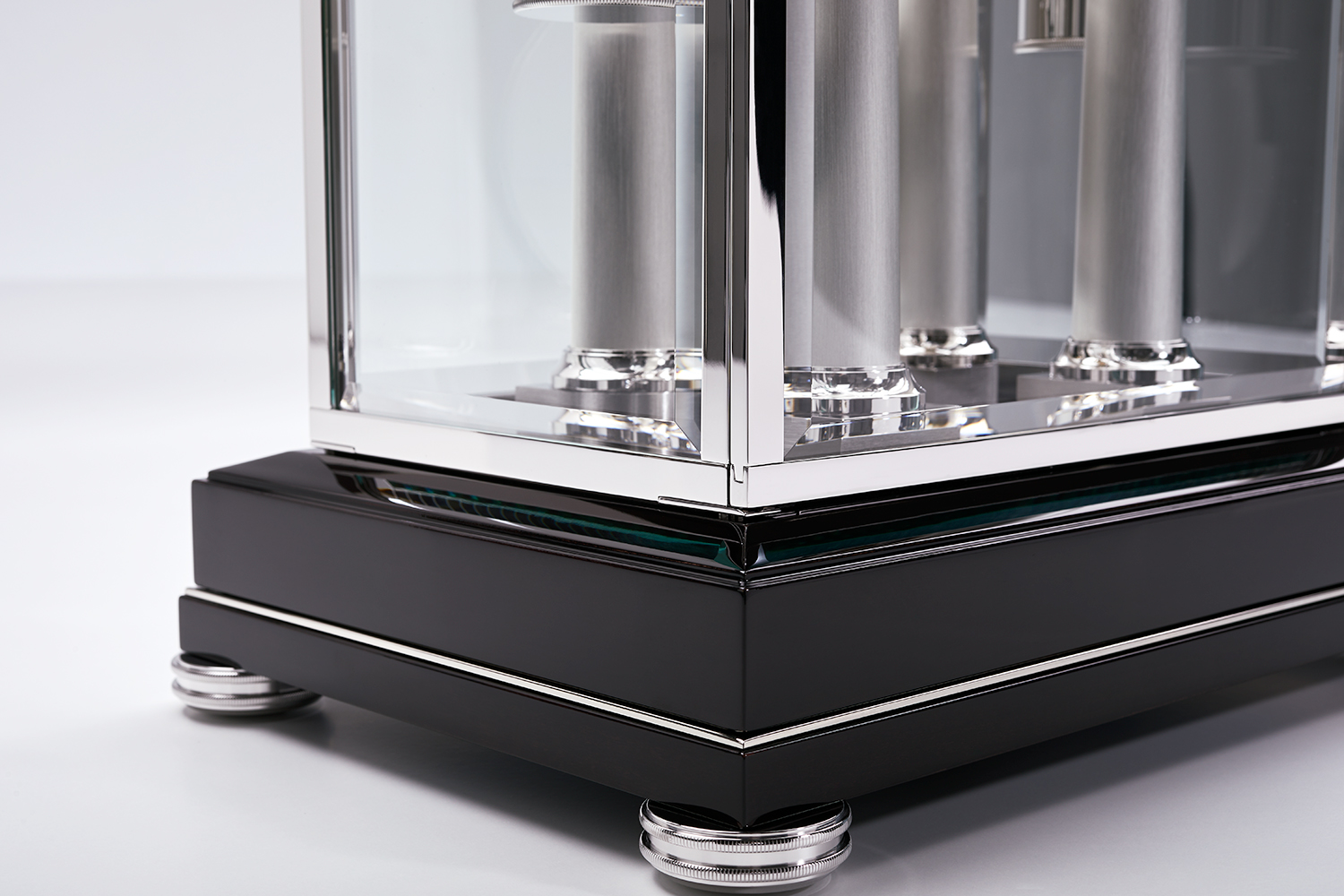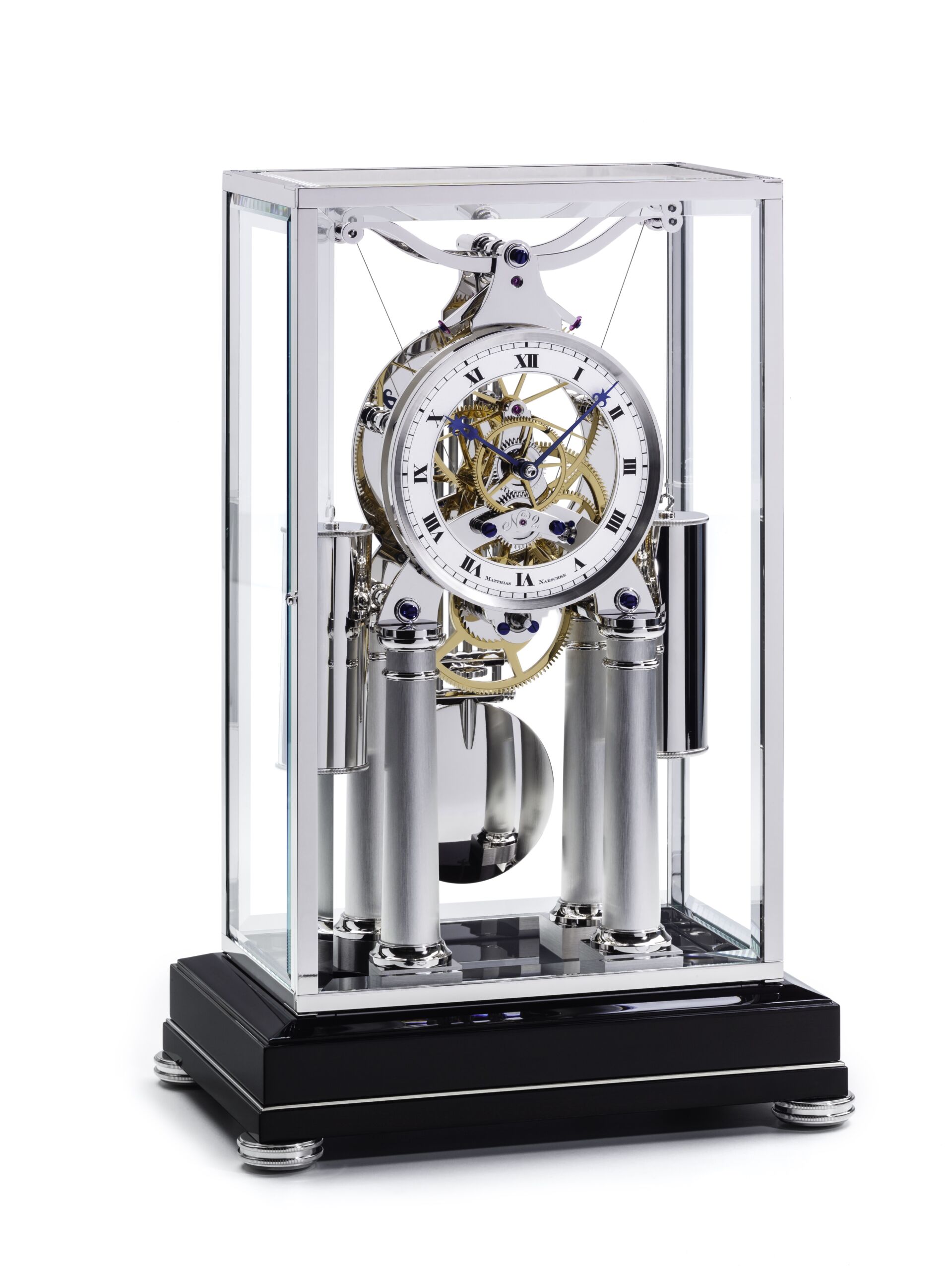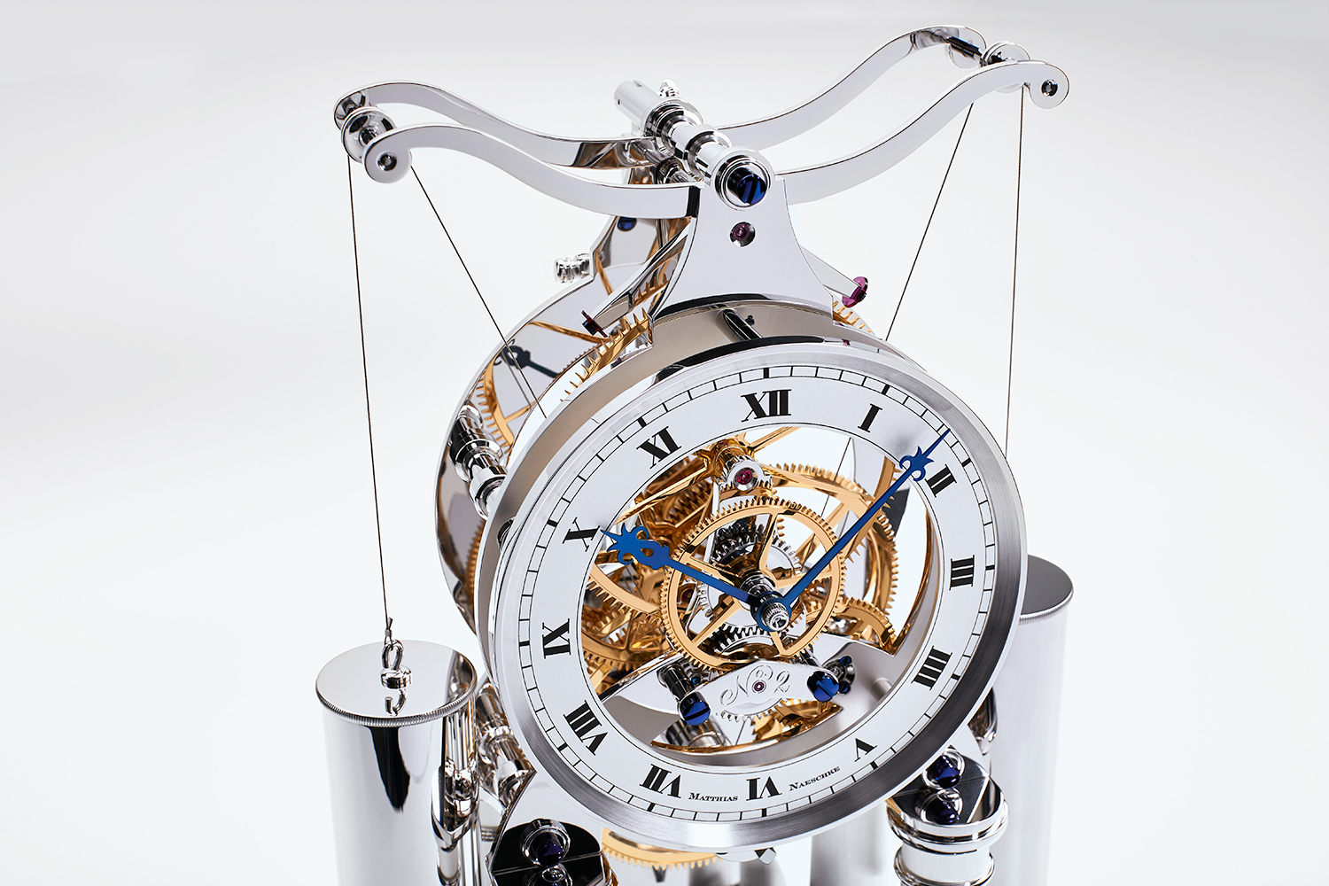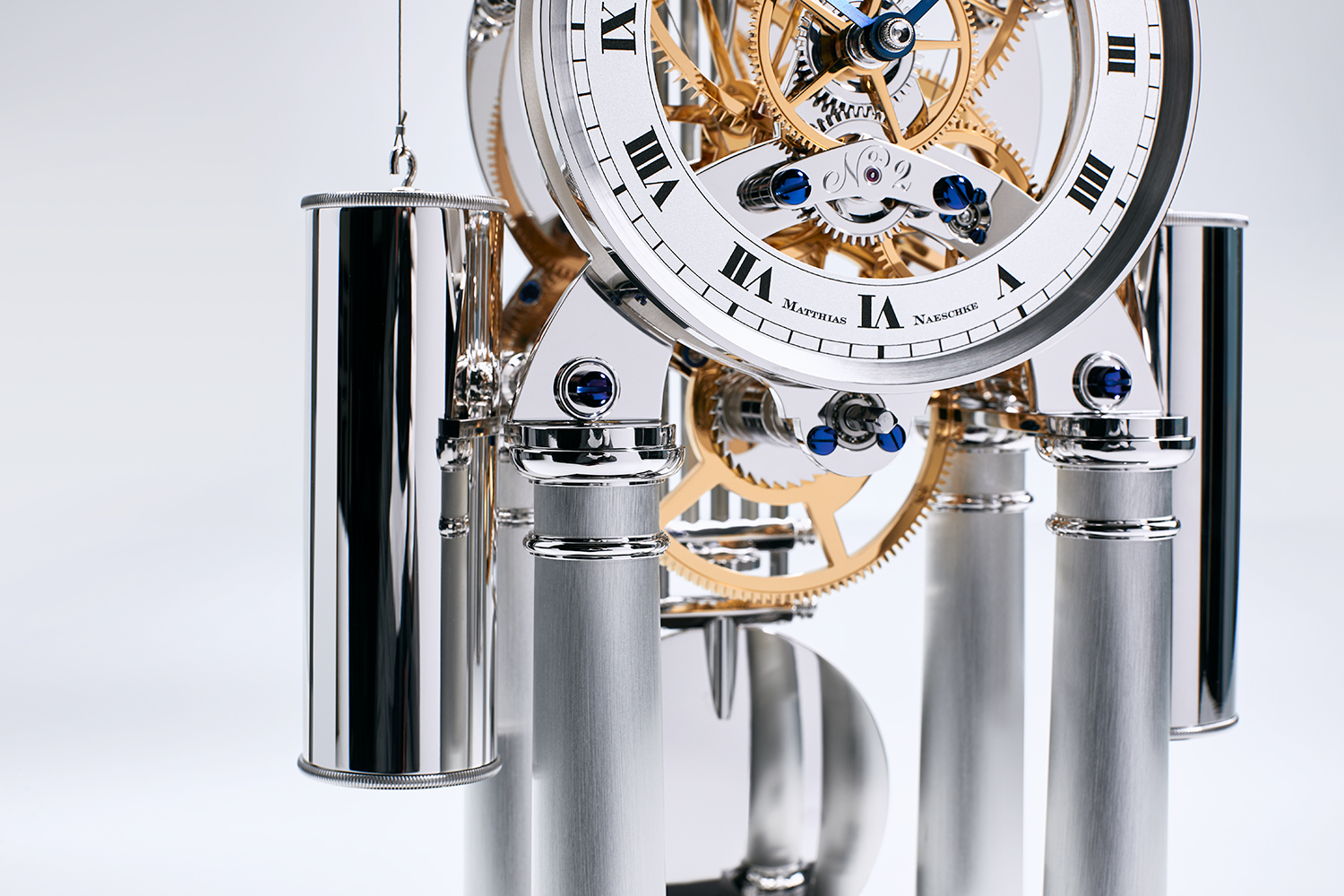 Neben den technischen Raffinessen kommt auch der Gestaltung eine entscheidende Rolle zu. So ist mit der Tischuhr NT 11 von Matthias Naeschke ein Gesamtkunstwerk aus beeindruckender Technik und klassischem Design entstanden. Eine Mischung, die unserem Empfinden nach, sehr gut in die heutige Zeit passt und in der rhodinierten Variante der Tischuhr NT 11 durchaus sehr modern wirkt. In der Ausführung als Skelettuhr bleibt nichts im Verborgenen. Der Betrachter kann jeden Bestandteil des Werkes genau einsehen und entdecken, mit welcher Akribie wir jedes noch so kleine Detail vollendet haben.