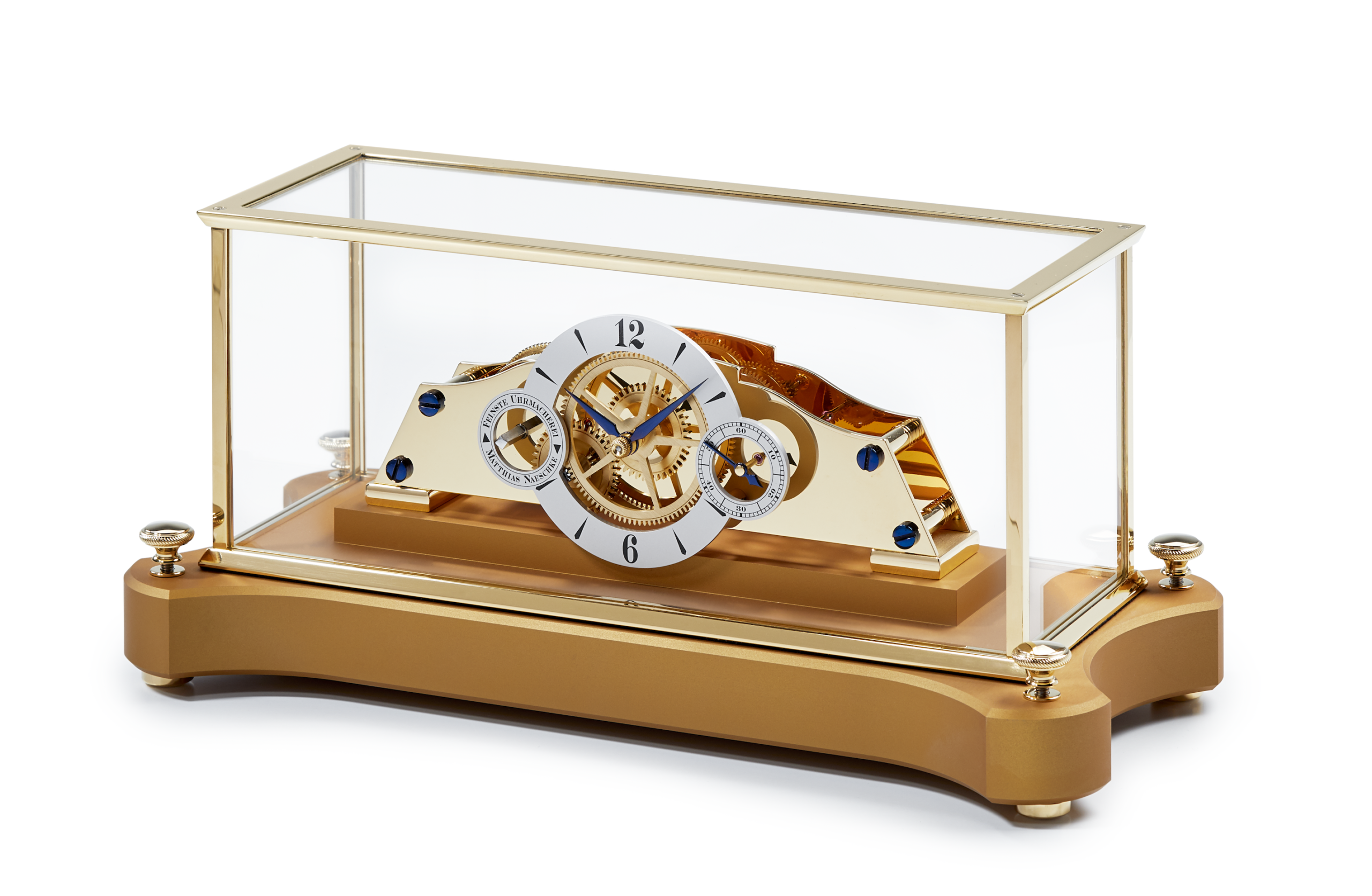 - Wir bieten umfangreiche Möglichkeiten einer Individualisierung an. Die Uhrwerke können in Gelbgold, Rhodium oder Roségold veredelt werden. Bei den Gehäusesockeln kann je nach Modell aus verschiedenen Hölzern, Steinen oder Metall ausgewählt werden.
