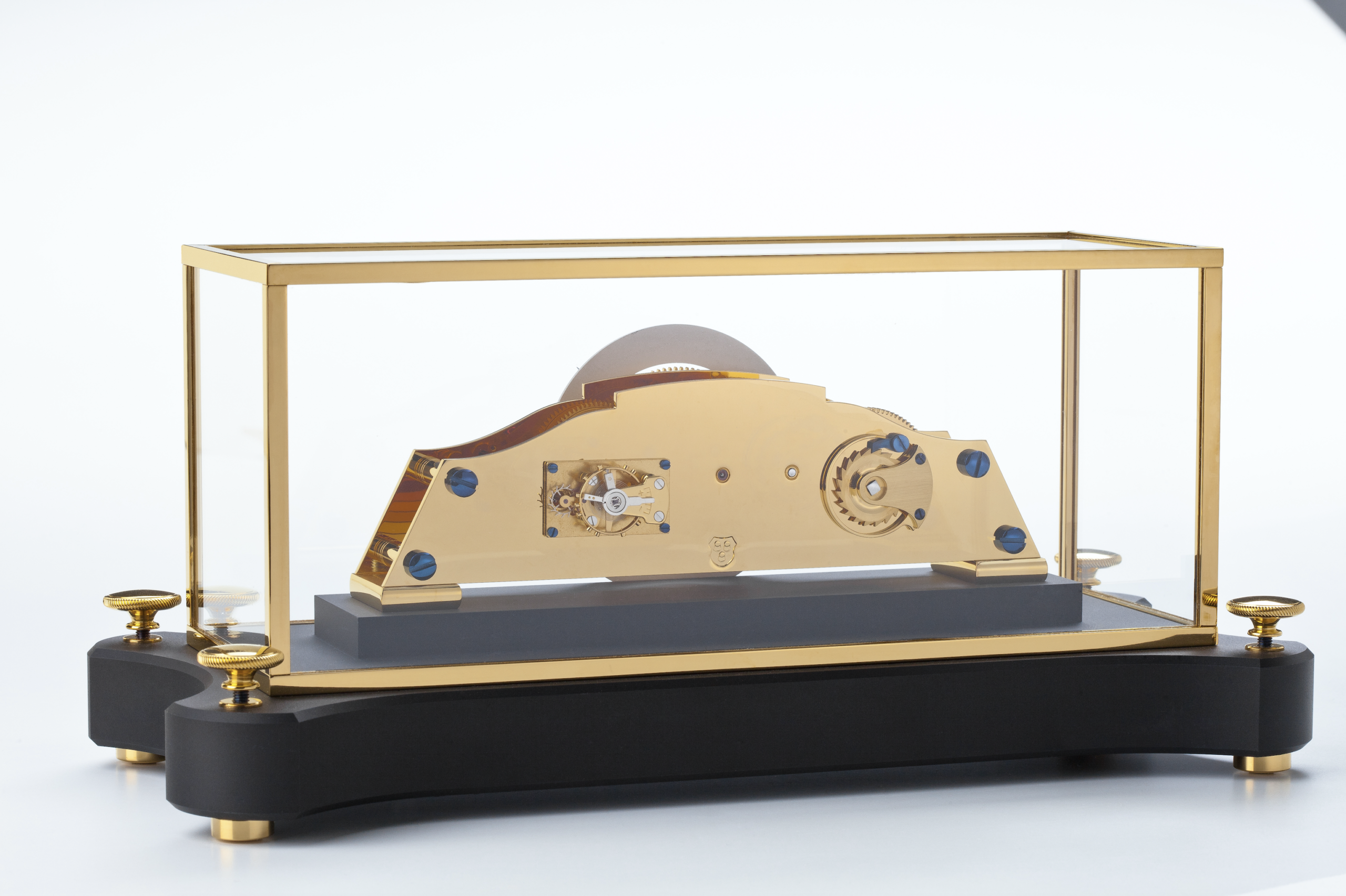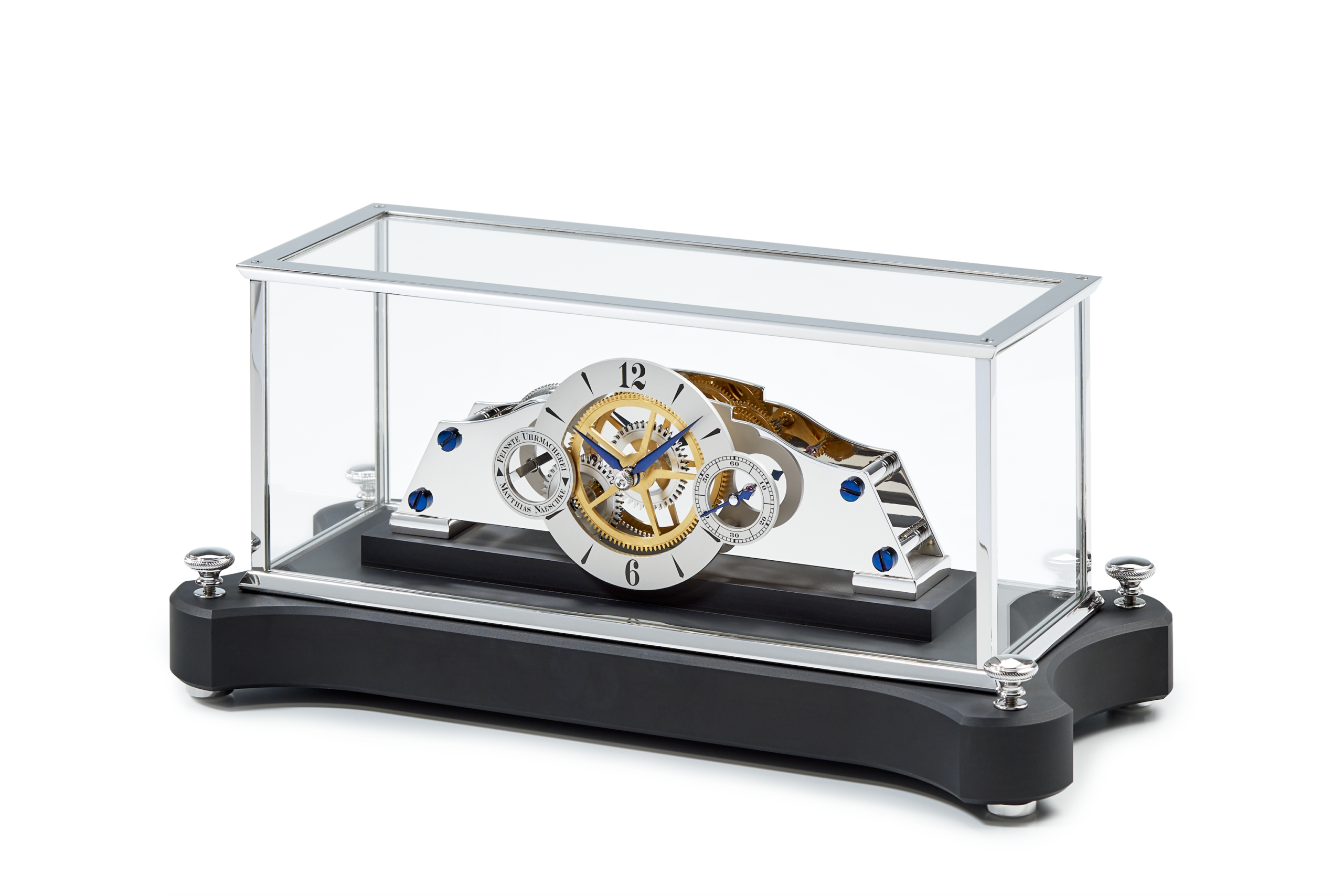 Luftig schwebt das filigrane Werk mit einer Laufdauer von 14 Tagen über seinem Sockel aus schwarz eloxiertem Aluminium. Ein akkurat gearbeiteter Glassturz ermöglicht einen rundum freien Einblick auf die beeindruckende Mechanik. Feine, polierte und über der Flamme gebläute Zeiger umrunden ein matt rhodiniertes Zifferblatt.