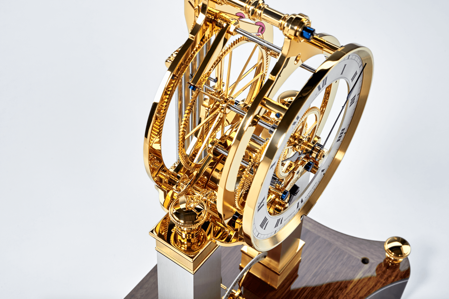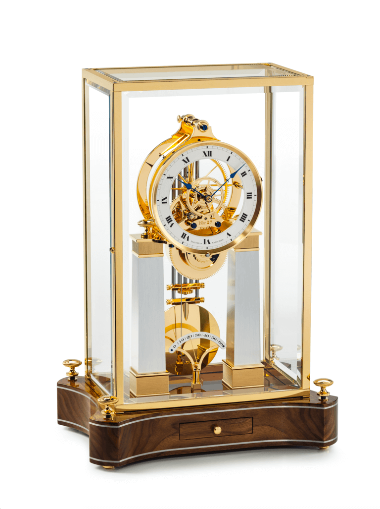 Das filigrane, skelettierte Werk verfügt über eine Gangreserve von zwei Wochen. Blickt man durch den matt versilberten Ziffernring, so entdeckt man die Besonderheit, die alle Uhrwerke der NT 6-Linie kennzeichnet – die übergroße Hemmung, die nahezu den ganzen Durchmesser des Werkes ausfüllt. Für Präzision der Tischuhr NT 6 „La céleste“ von Matthias Naeschke sorgt ein im Halbsekundentakt schwingendes 5-Stab-Kompensationspendel.