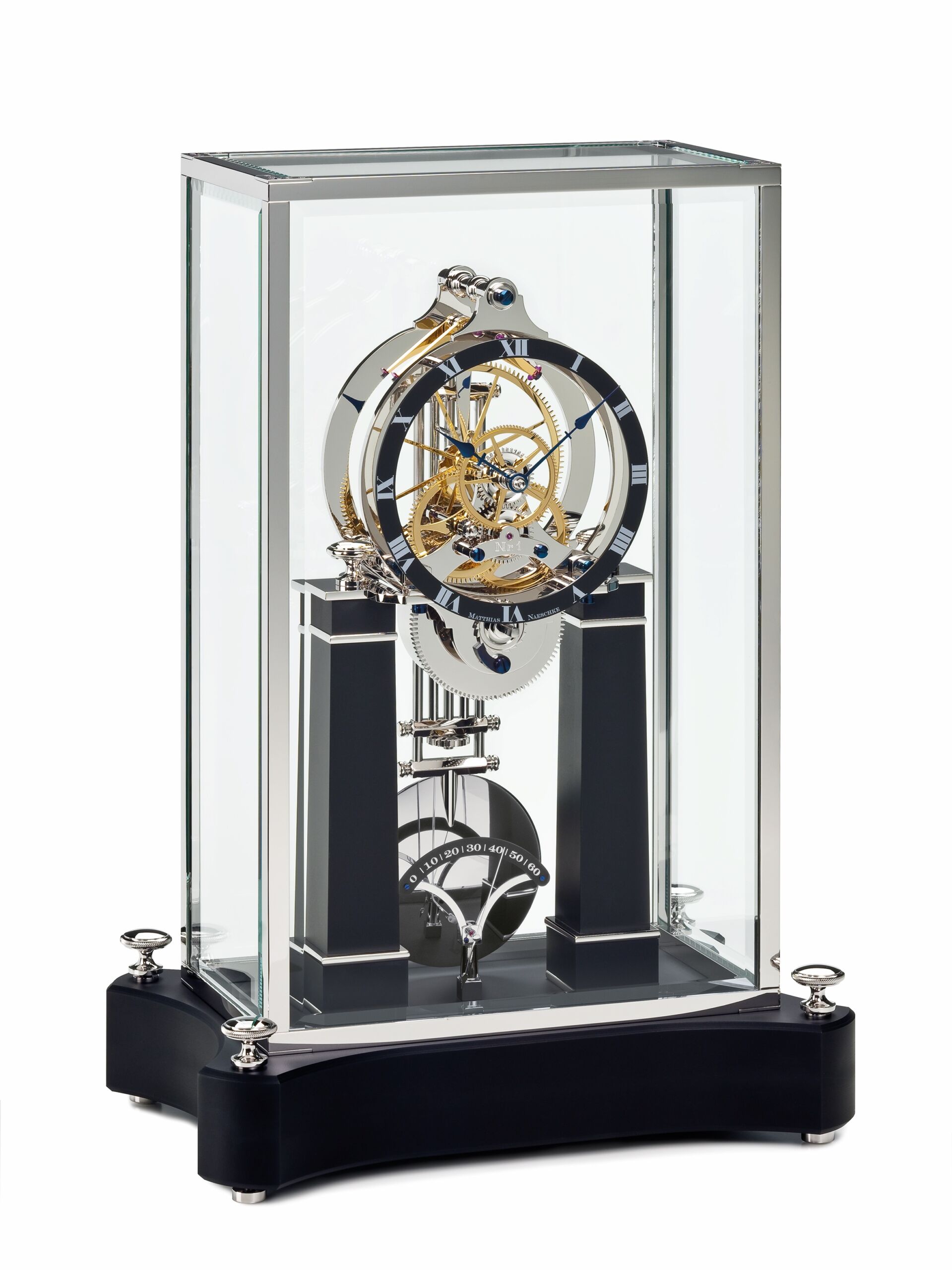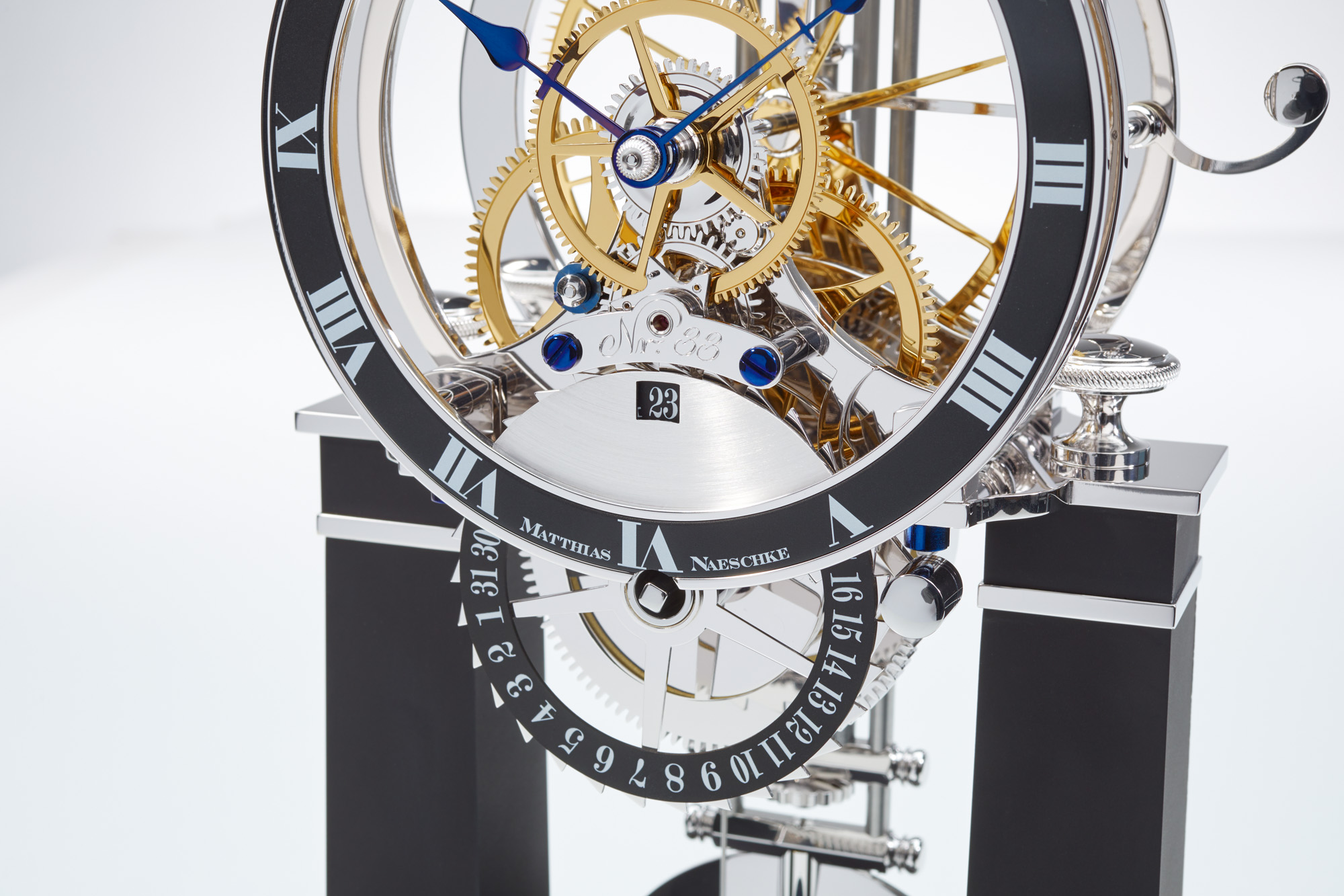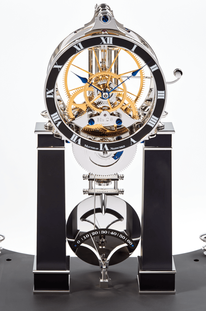Unser ganzes uhrmacherisches Können und unseren Hang zu außergewöhnlichen Kreationen haben wir in die Tischuhr NT 6 „La brillante“ von Matthias Naeschke einfließen lassen. Klare Gehäuselinien, moderne Materialien und ein zeitlos und klassisch gestaltetes Werk vereint diese Uhr in sich.