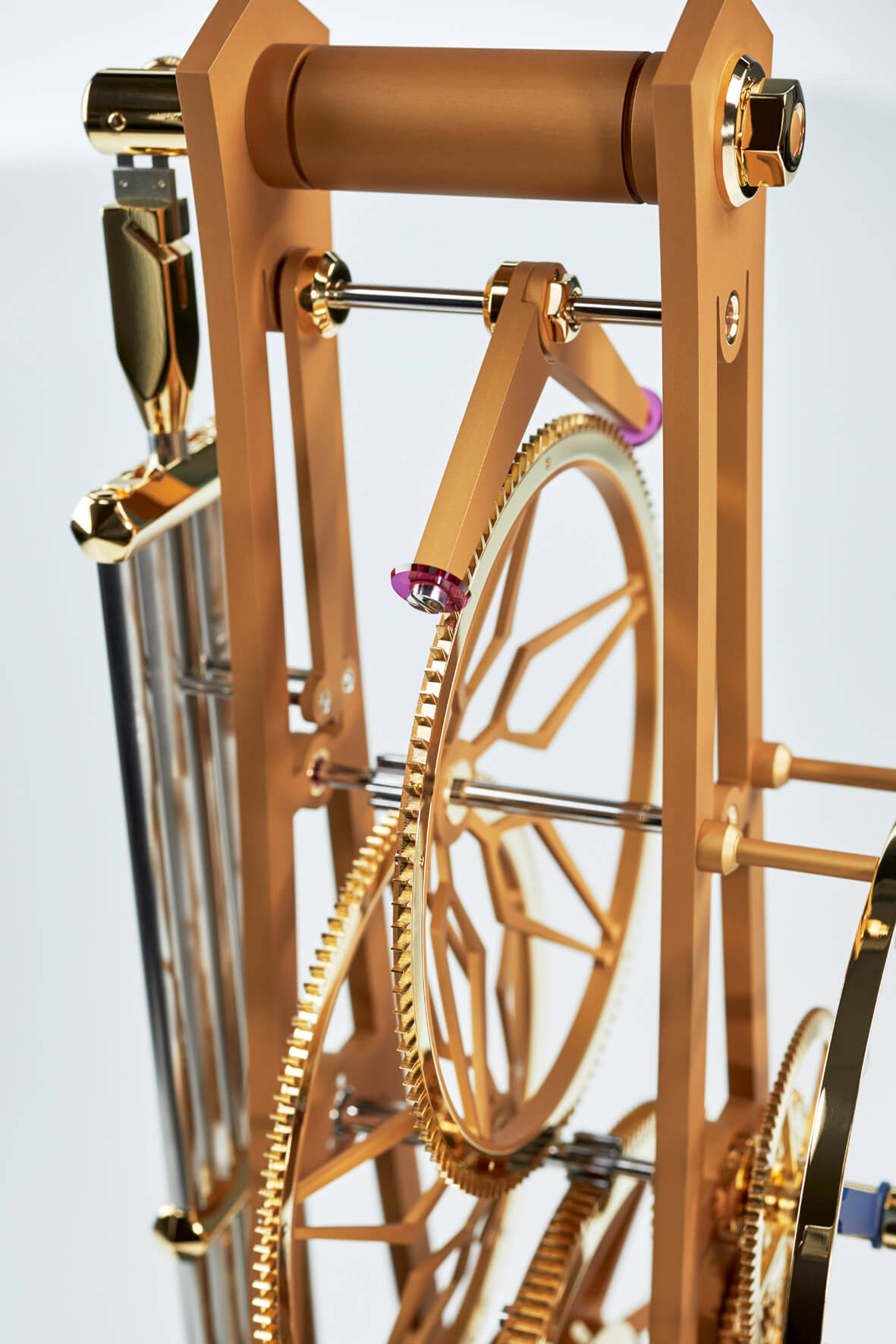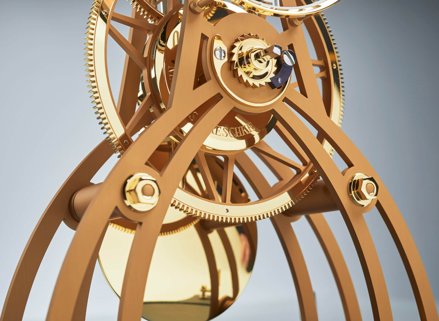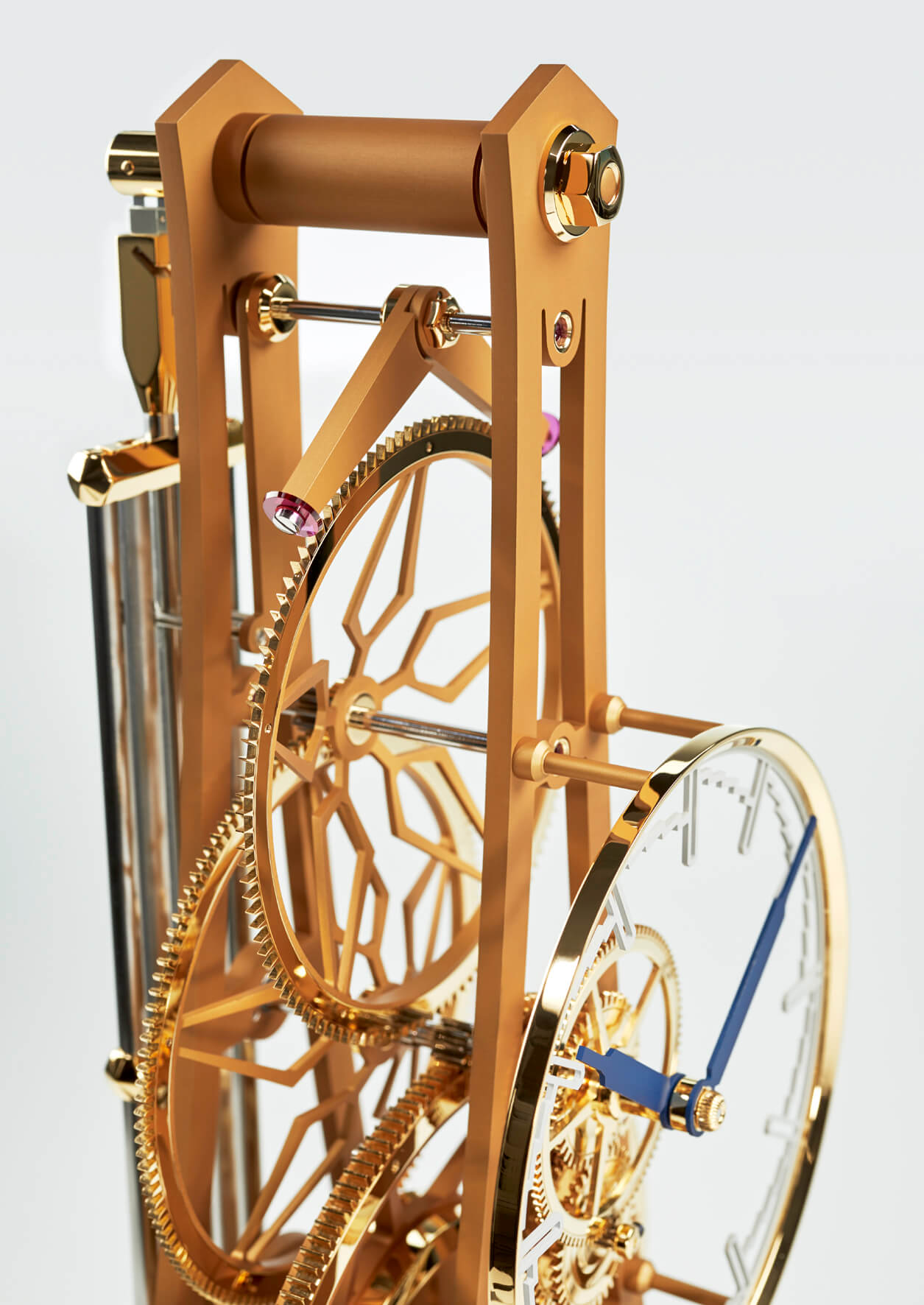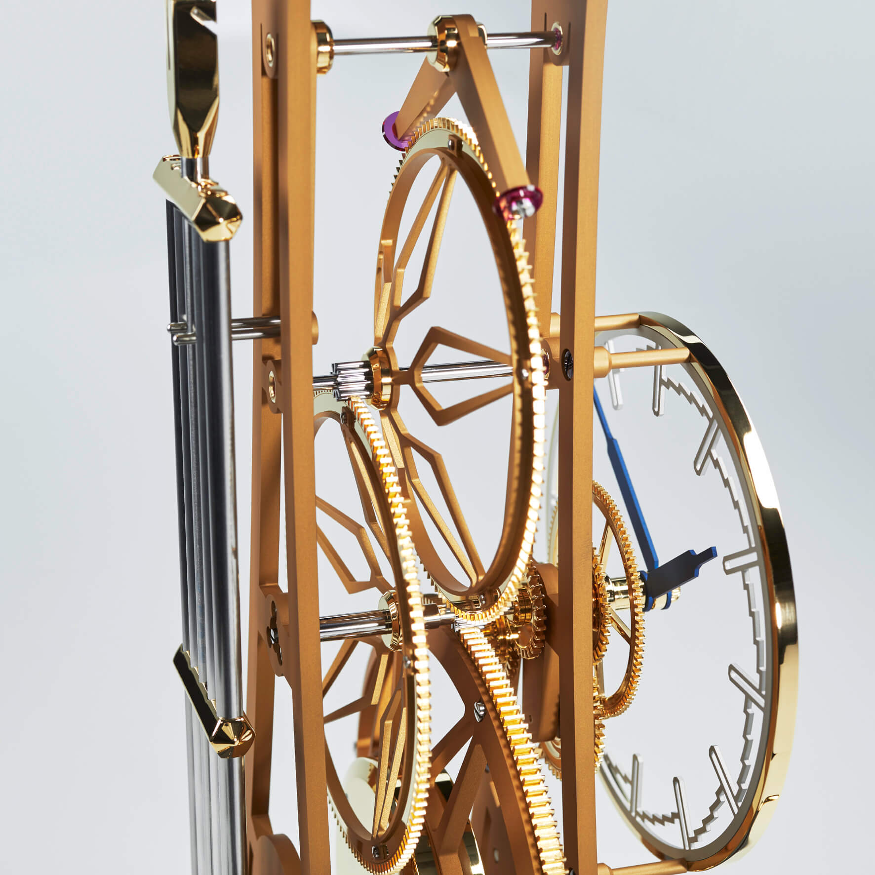 Gerade einmal 1,5 kg bringt das gesamte Uhrwerk mit Zifferblatt und Kompensationspendel auf die Waage. Im wahrsten Sinne des Wortes kein Gramm zuviel, wiegen beispielsweise die an das filigrane Gerippe eines Flugzeugflügels erinnernden durchbrochenen Platinen des Uhrwerkes. Sie bestehen aus einer Aluminiumlegierung und sind nur an solchen Stellen verstärkt ausgeführt, an denen es technisch unbedingt notwendig ist. Das Werk-Gestell mit seinen fünf soliden Pfeilern wird durch neun markante, polierte Sechskantmuttern anstelle von Schrauben zusammengehalten.