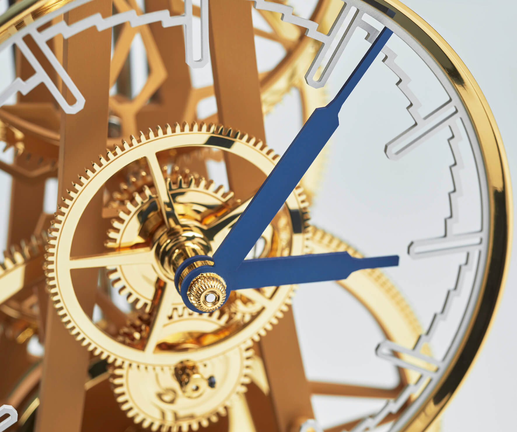 Einen unkonventionellen Weg haben wir ebenfalls beim Design des skelettierten Ziffernrings eingeschlagen. Statt eines mit Ziffern und einer Minuterie bedruckten Reifs, wird die Zeit bei dieser Tischuhr geometrisch erfasst. Jede der vier Minuten zwischen zwei 5-Minuten-Schritten hat jeweils eine eigene kleine Stufe bekommen. Die Spitze des Minutenzeigers durchläuft diese einzelnen Stufen und die Uhrzeit kann somit sehr präzise abgelesen werden.