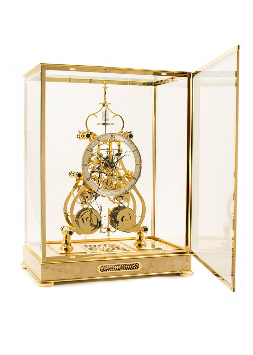 Die Tischuhr “Two Train Condliff Clock” mit zwei Zügen wurde nach dem Entwurf von James Condliff, Liverpool, um 1860 gefertigt und stellt die neueste Ergänzung der Reihe von Skelettuhren von Sinclair Harding dar. Sie basiert auf dem Serie-2-Stil des renommierten Liverpooler Uhrmachers James Condliff.