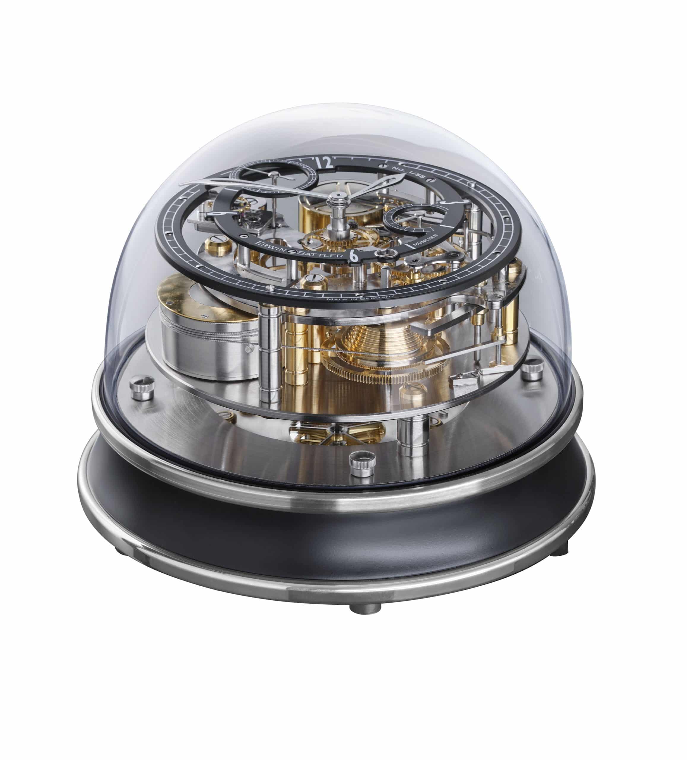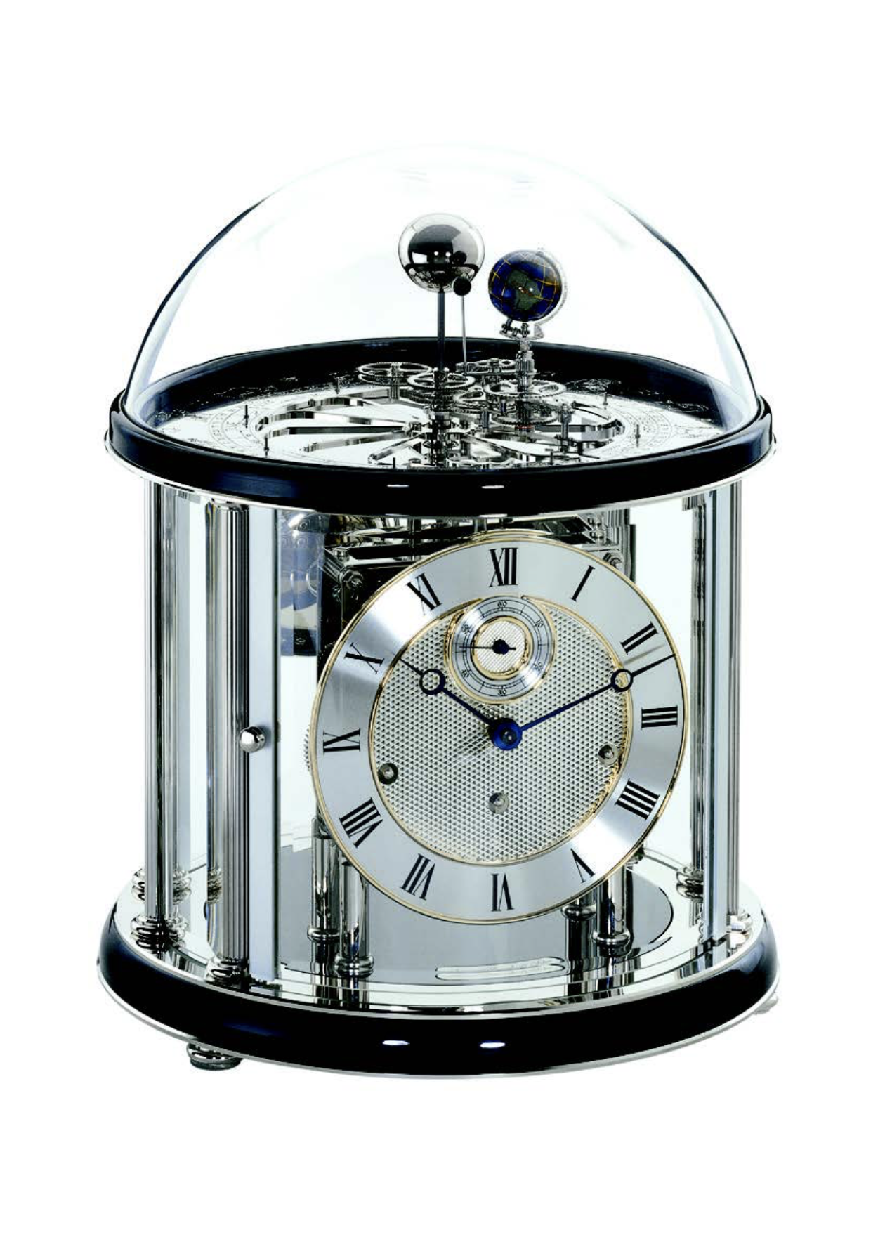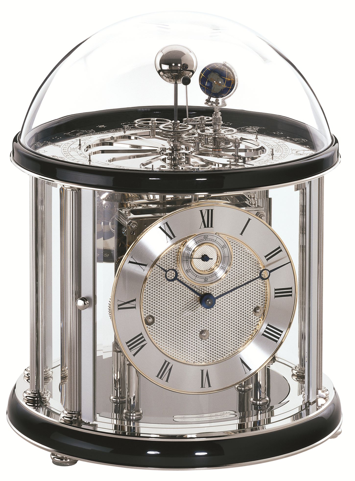 Das Tellurium 22823-740352 von Hermle in Chrom/Schwarz zeigt einmal den Umlauf der Erde um die Sonne innerhalb eines Jahres, wobei sich die Erde alle 24 Stunden einmal um sich selbst dreht. Gleichzeitig umkreist der Mond alle 29 1/2 Tage einmal die Erde und vollführt dabei eine Rotation um die eigene Achse, wodurch von der Erde aus die einzelnen Mondphasen erkennbar sind. Die Erde durchläuft dabei die 12 Tierkreiszeichen, die Monate und Tage, die auf einem flachen Zifferblatt abgelesen werden können. Das Uhrwerk der Tellurium 22823-740352 von Hermle verfügt über 8-Tage 4/4 Westminster- Schlagwerk auf vier polierten Glocken. Sekunde im Kraftfluss, Federzug, 11-steiniges Schweizer Echappement, polierte Platinen, automatische Nachtabschaltung des Schlagwerks. Gefräste Darstellungen der 12 Tierkreiszeichen auf durchbrochener, polierter Rosettenronde. Gefräste Kalenderdarstellung von Monat und Tag. Tellurium-Dreharm mit Zeiger und Darstellung von Sonne, Mond und Erde.