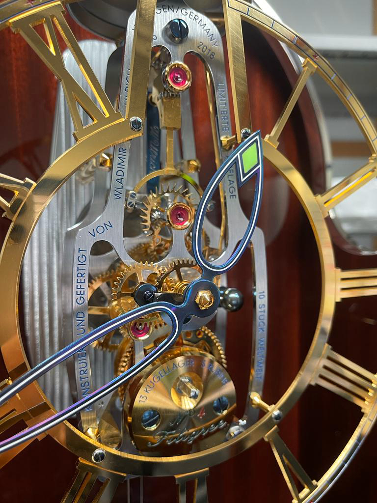 Das neue und sehr fein skelettierte Werk ist aus reinem Messing verchromt. Die Vorderseite ist strichgeschliffen, die Seitenteile sind poliert und der Rädersatz wurde zusätzlich vergoldet. Ein verchromter Zahlenreif unterstreicht die Form des besonderen Gehäuses.