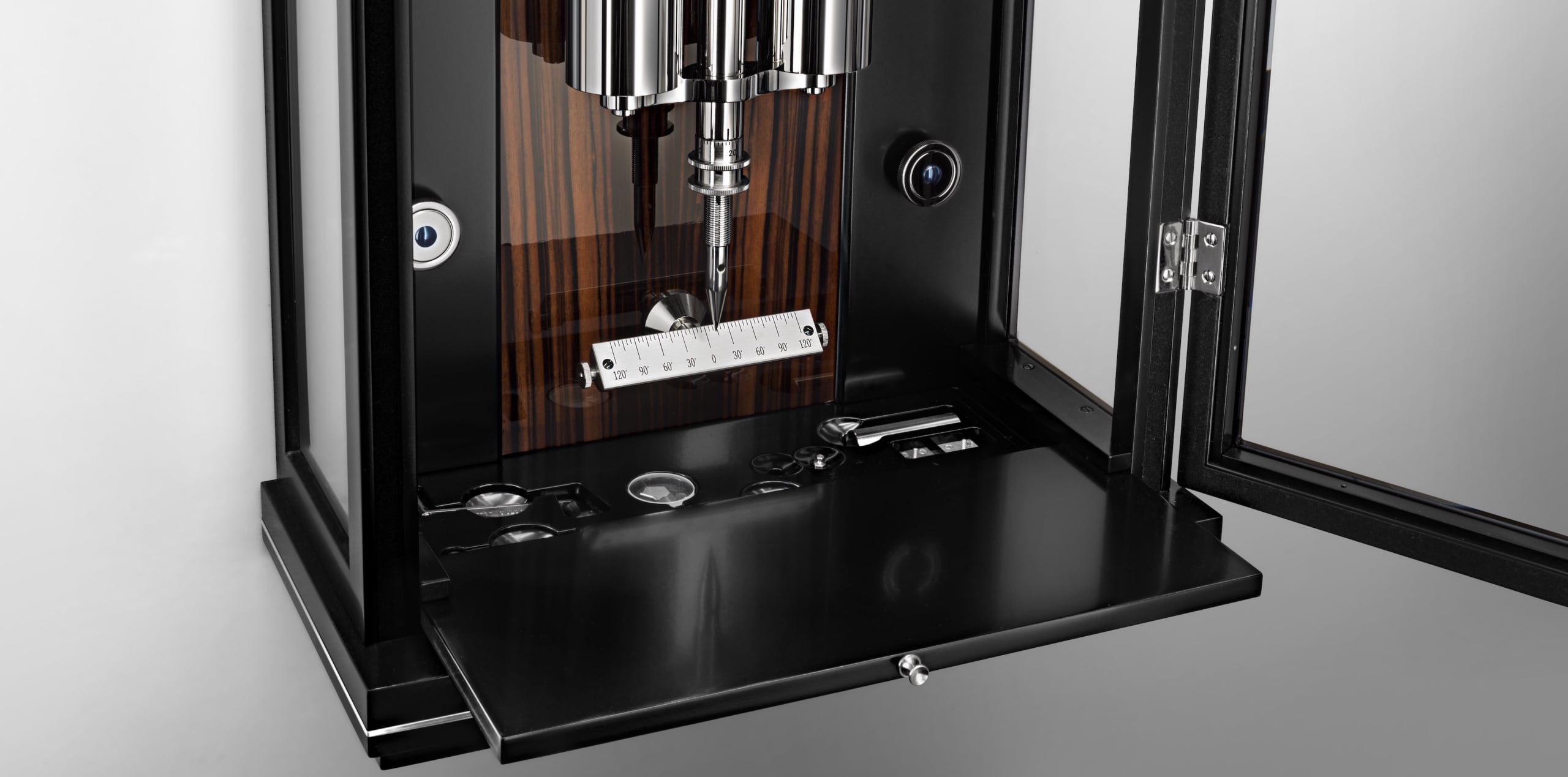 Gehäuse: Schwarzer Schleiflack mit Metallintarsien und handpolierter Kassette oder Makassar-Kassette, Glasdach, Tür mit Magnetverschluss