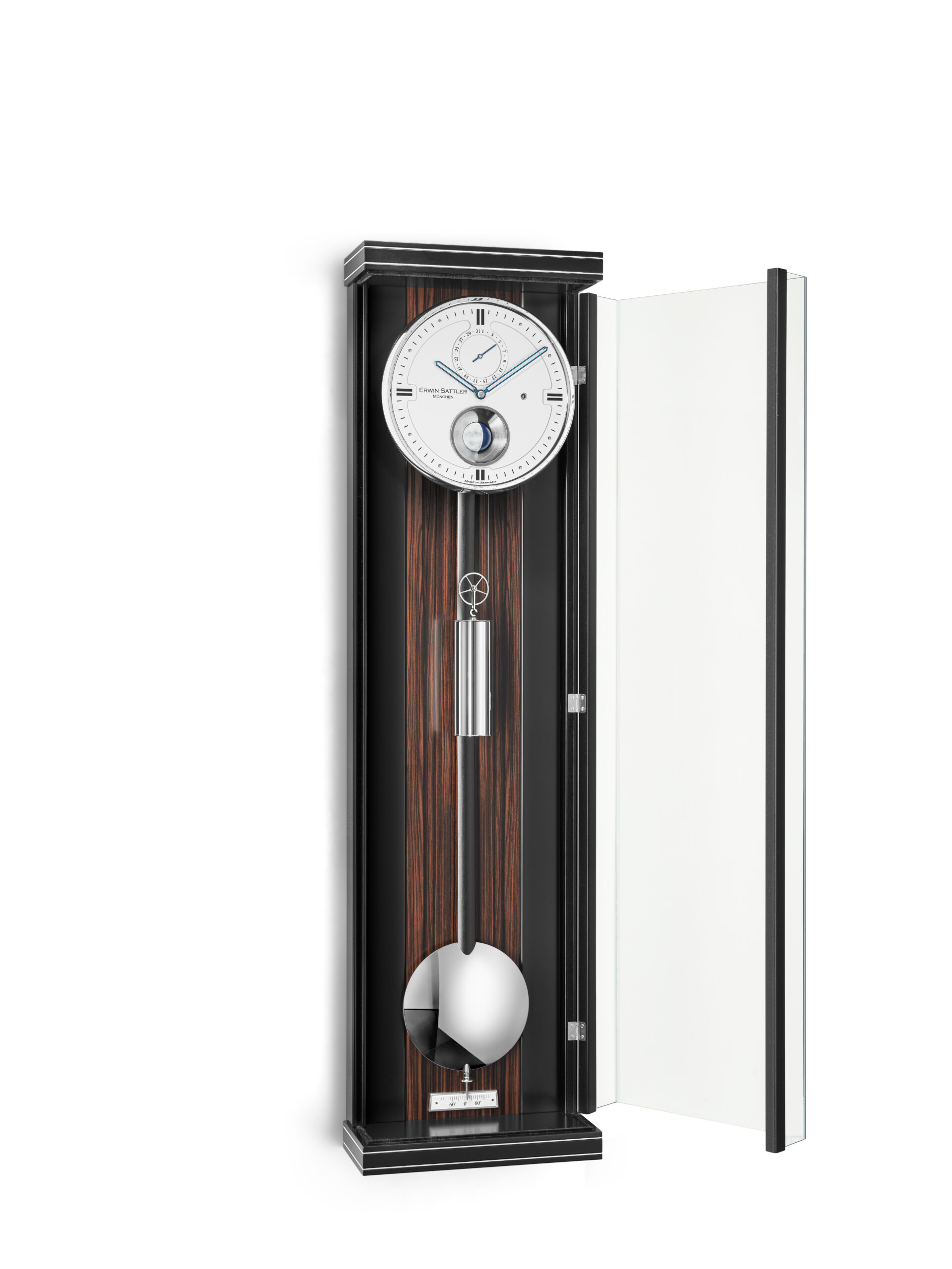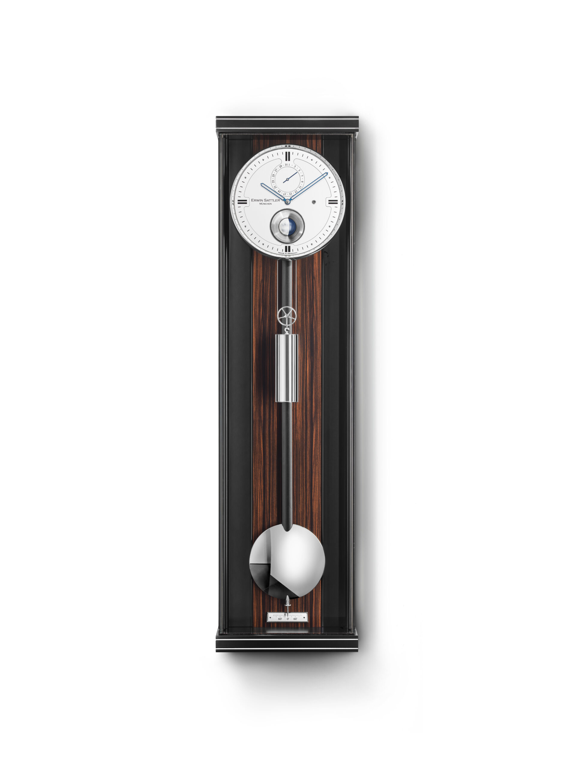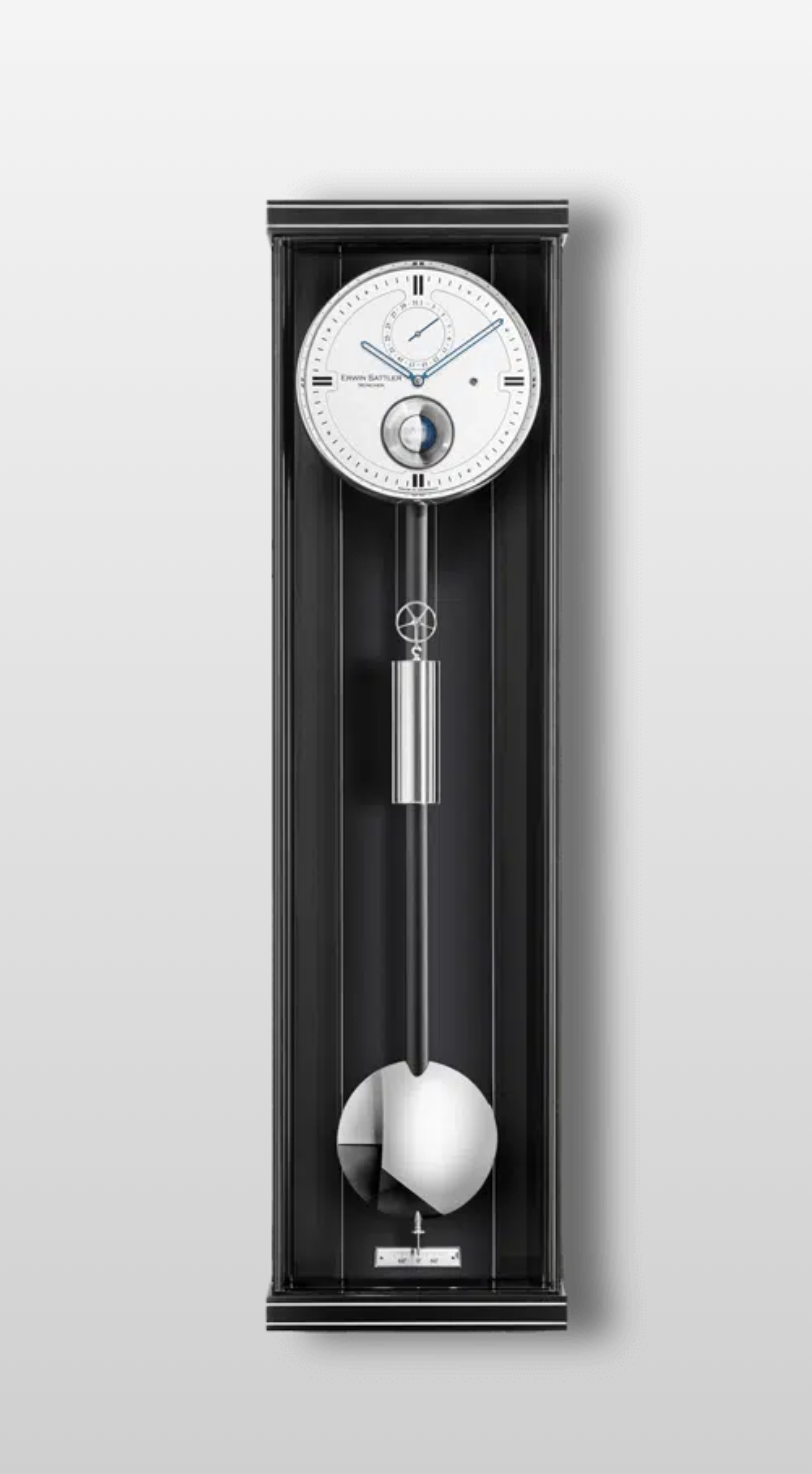 Das Opus Gehäuse, die modernste Gehäusevariante der Großuhrenmanufaktur Erwin Sattler, kombiniert mit dem im Hause Sattler entwickelten Kaliber 1577, findet seinen Höhepunkt in der Wanduhr Opus PMD 100.