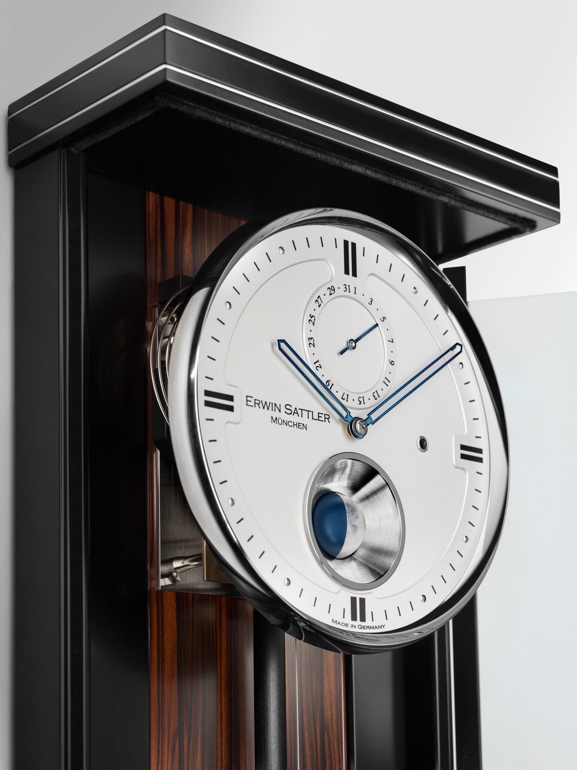 ALLES VEREINT – UHRZEIT, DATUM, PASSAGESCHLAG UND EINE DREIDIMENSIONALE MONDPHASENANZEIGE IN DER WANDUHR OPUS PMD 100 VON ERWIN SATTLER