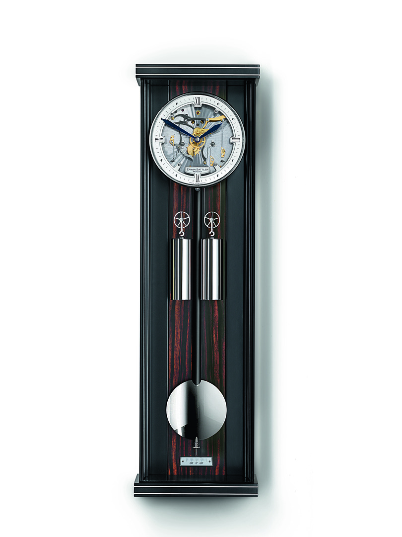 Jede Uhr von Erwin Sattler wird individuell und liebevoll in der Manufaktur in Gräfelfing bei München gefertigt. Höchste Qualität und Langlebigkeit machen die Zeitmesser zu zuverlässigen und attraktiven Wohnaccessoires. Dafür sorgen im Inneren der Wanduhr Aperia S 70 fünfzehn Stein- und vier Kugellager. Ihre einzigartige Ausstrahlung verdankt sie ihrer neuen Optik, geprägt von dem schlichten und doch eleganten Gehäuse aus schwarzem Schleiflack mit filigranen Metallintarsien an Sockel und Sims und dem auf Gehrung verklebten U-Glas.