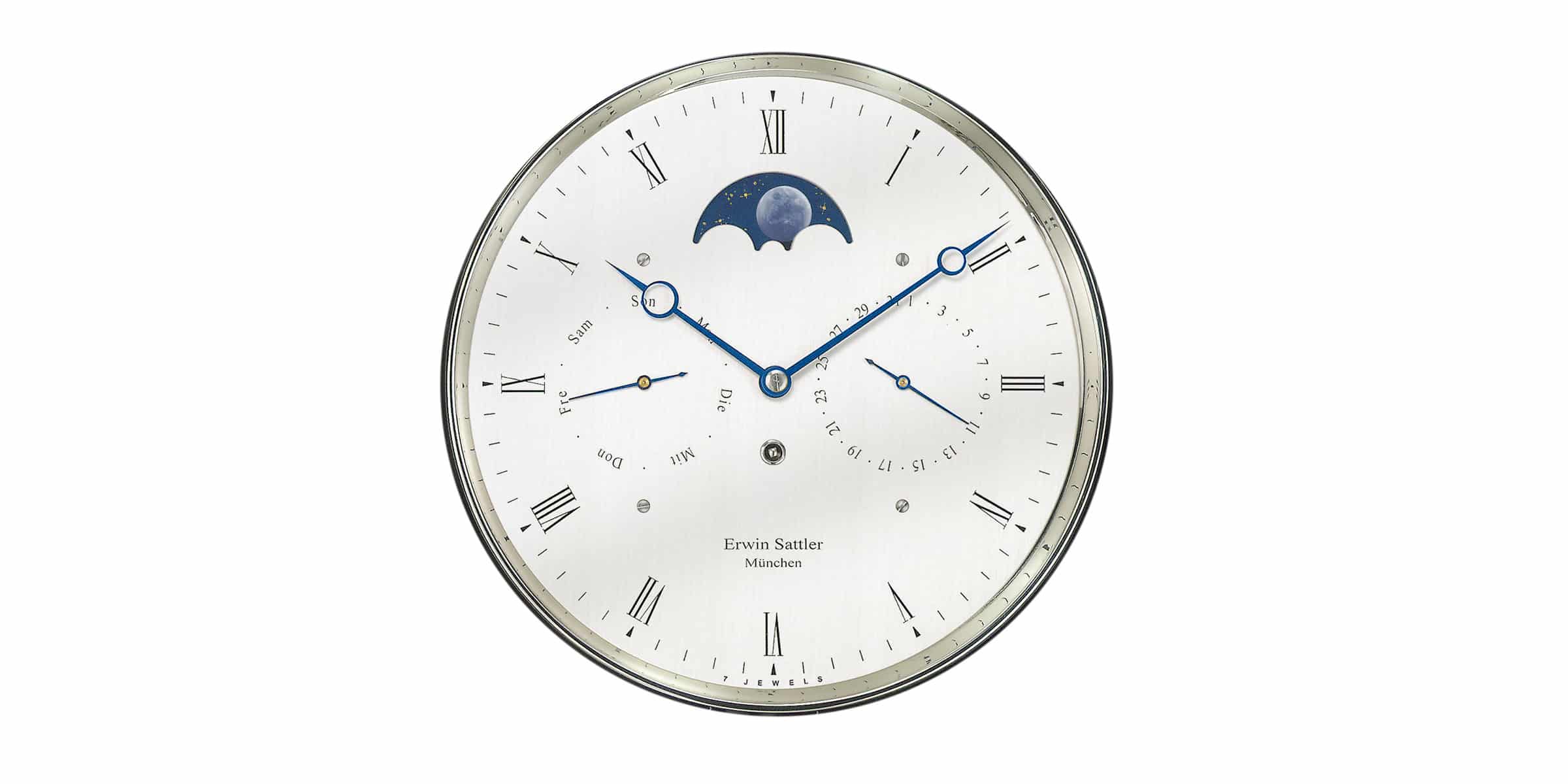 Damit widmet sie einen exklusiven Platz auf ihrem Antlitz dem mystischen Begleiter der Erde, dessen Auswirken auf das Leben schon immer ein fesselndes Thema war und noch ist. Auf der Wanduhr Classica K 100 (Eibe) ergänzt er wundervoll die Hilfszifferblätter des Kalenders und verleiht der Uhr von Erwin Sattler eine abwechslungsreiche Ästhetik.