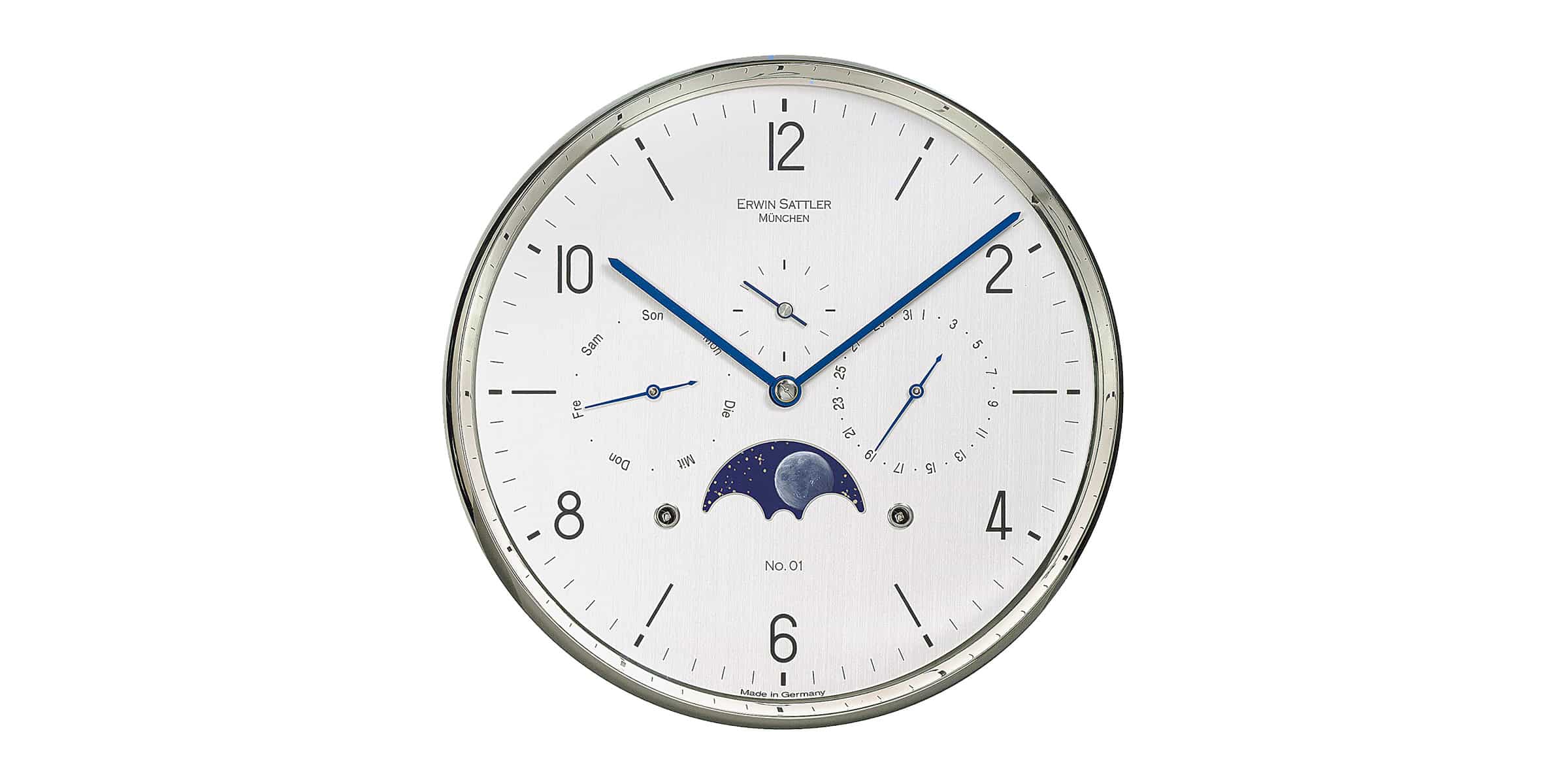 Zifferblatt: versilbert, handbemalte Mondscheibe, Anzeige von Datum und Wochentag
