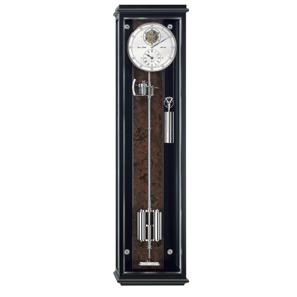 Mit einer Ganggenauigkeit von ca. ein bis zwei Sekunden pro Monat und dem 30-Tage-Uhrwerk bietet die Wanduhr Classica Secunda 1995 (Schwarz/Nußbaum) von Erwin Sattler auch technische Höchstleistung. Die Graham-Hemmung mit Steinpaletten bürgt für eine gleichmäßige Übertragung der Energie auf das Pendel. Vergoldete Räder, Wellen aus schwedischem Spezial-Stahl, fünf Kugellager und elf Rubinlochsteine in zwei Werkplatinen aus vier Millimeter starkem Hartmessing erhöhen Wirkungsgrad und Dauerhaftigkeit dieser „Uhr für Generationen“.
